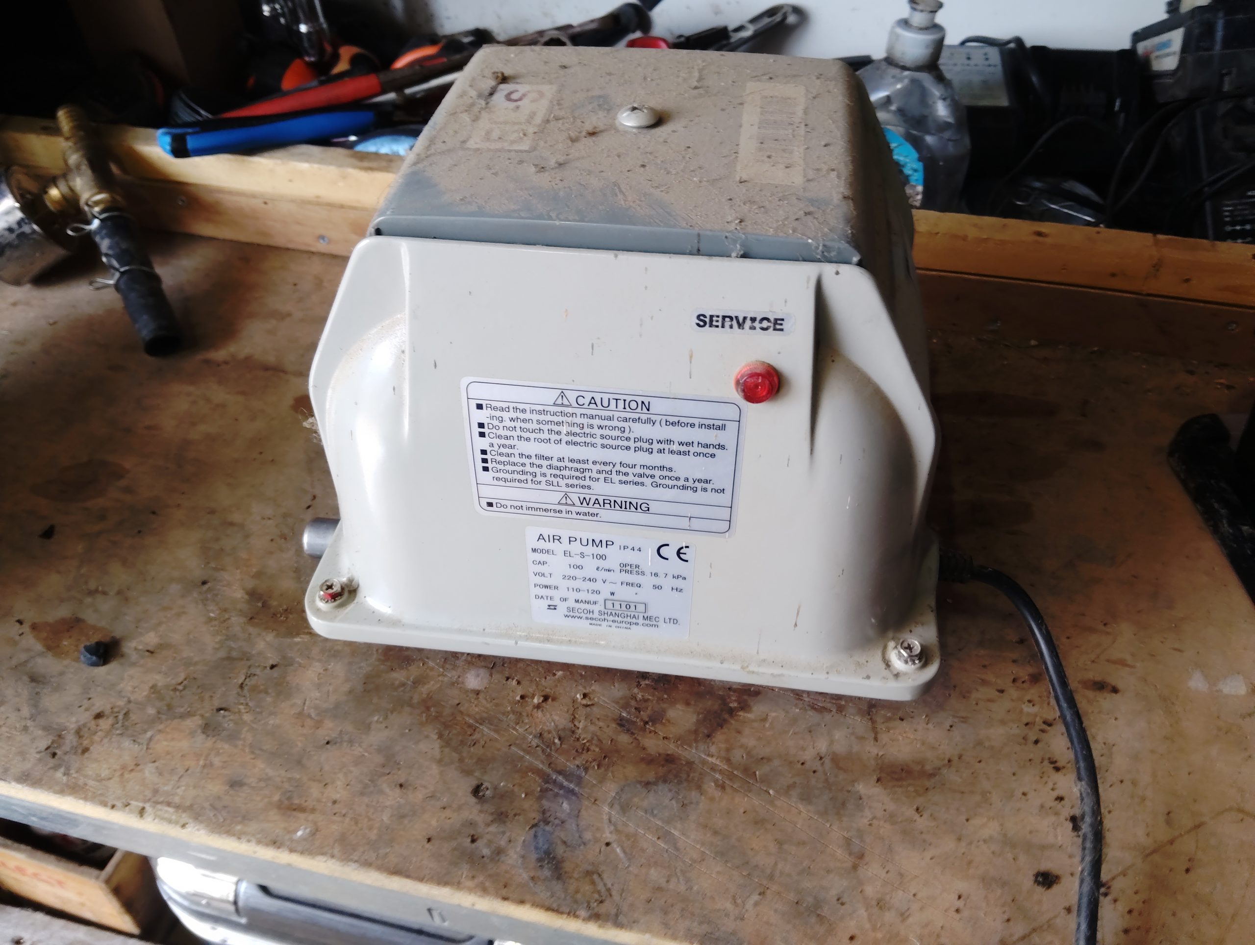 La filière maintenant de nouveau opérationnelle, nous poursuivons avec son entretien courant, notamment avec la maintenance du compresseur à membranes SECOH EL-S-100 : changement des membranes, changement des chambres à clapet, changement du filtre à air. La pression de service et la pression max. sont ensuite contrôlées. Ici tout va bien, avec respectivement 250 mbar et 500 mbar.