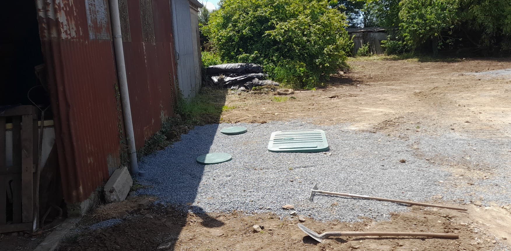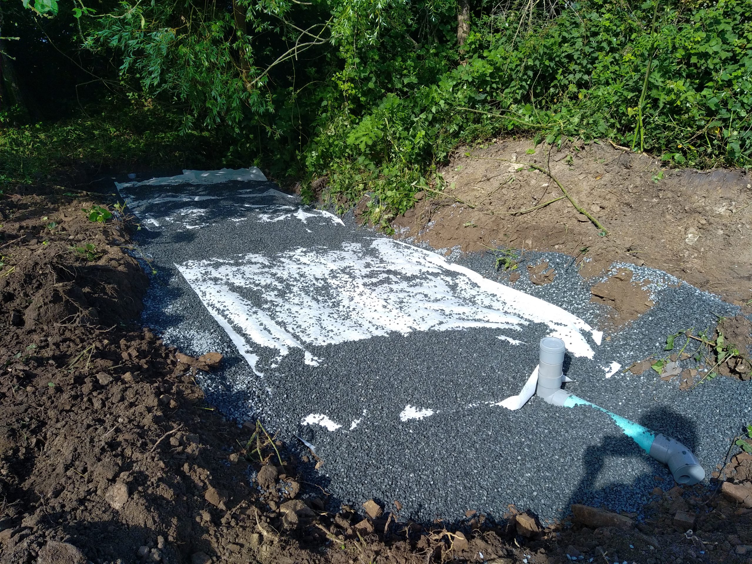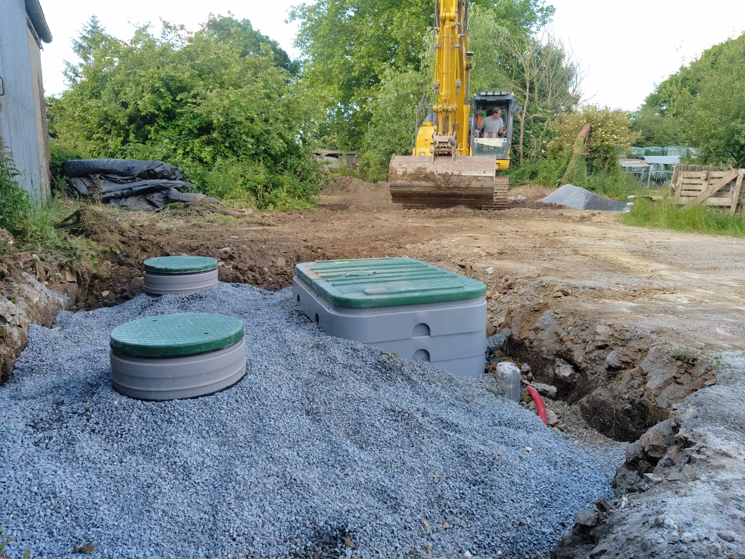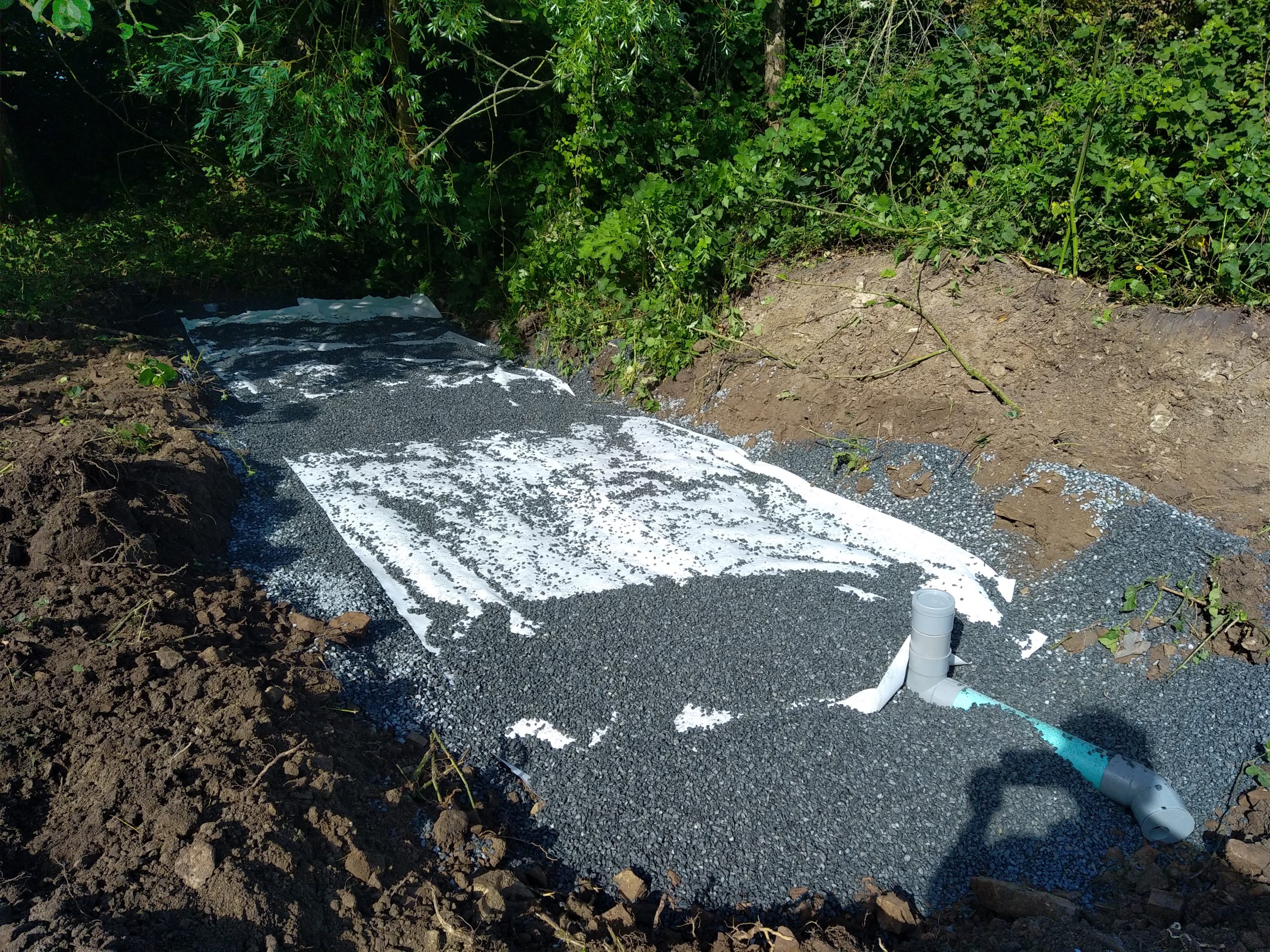 Avec un sol argileux, lourd et hydromorphe à très faible profondeur, les cuves sont posées sur un lit de béton et remblayées latéralement avec du béton dosé à 250 Kg de ciment par m3. La finition en surface est réalisée avec du gravier 6-10 mm.