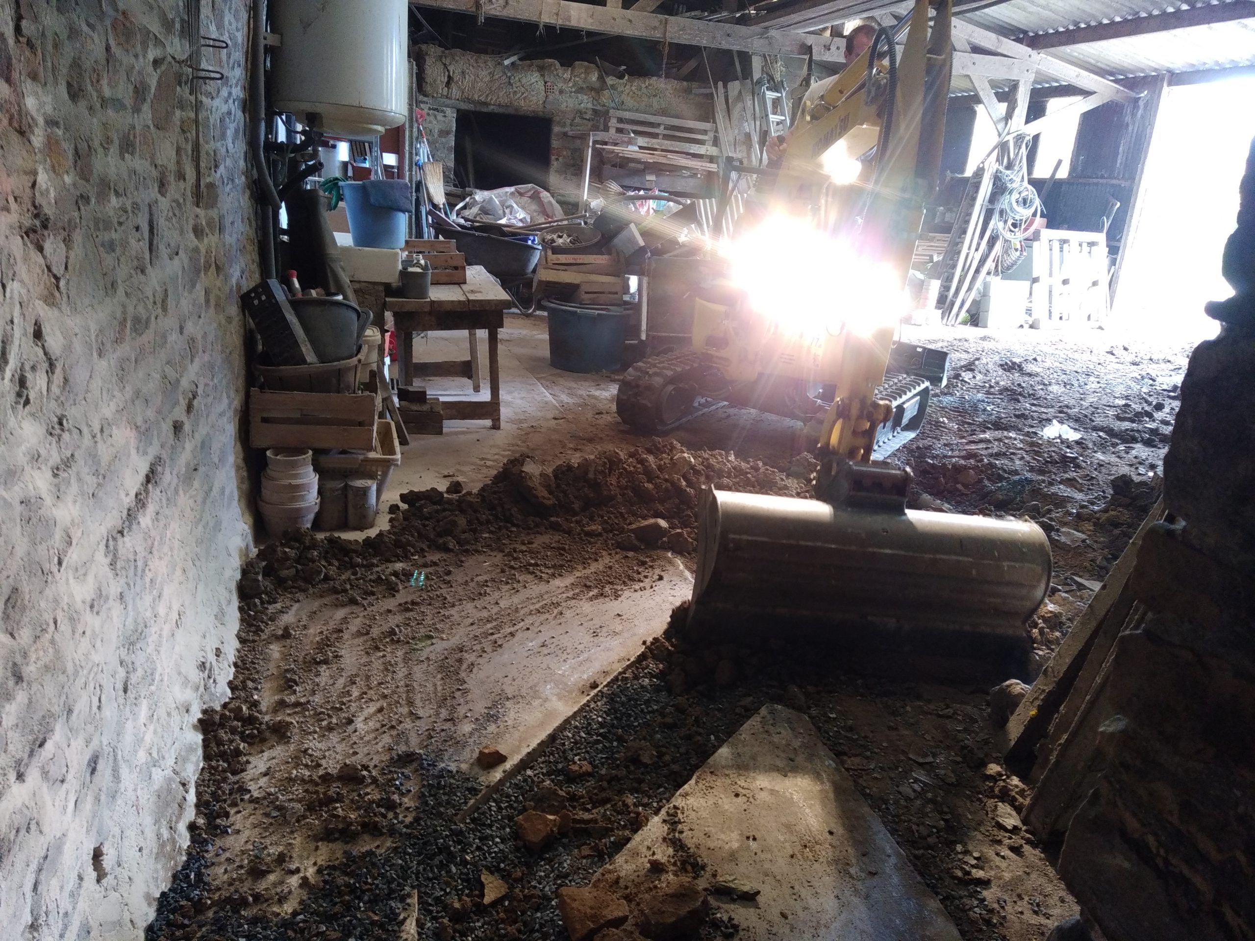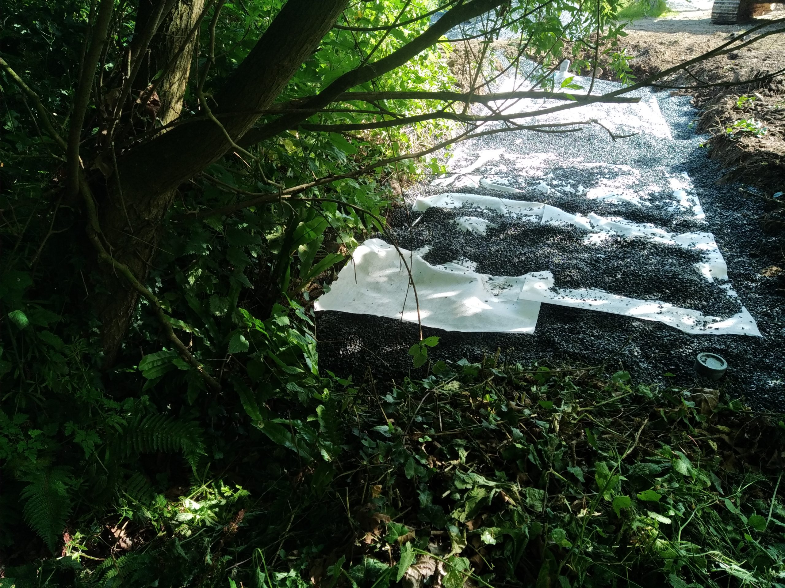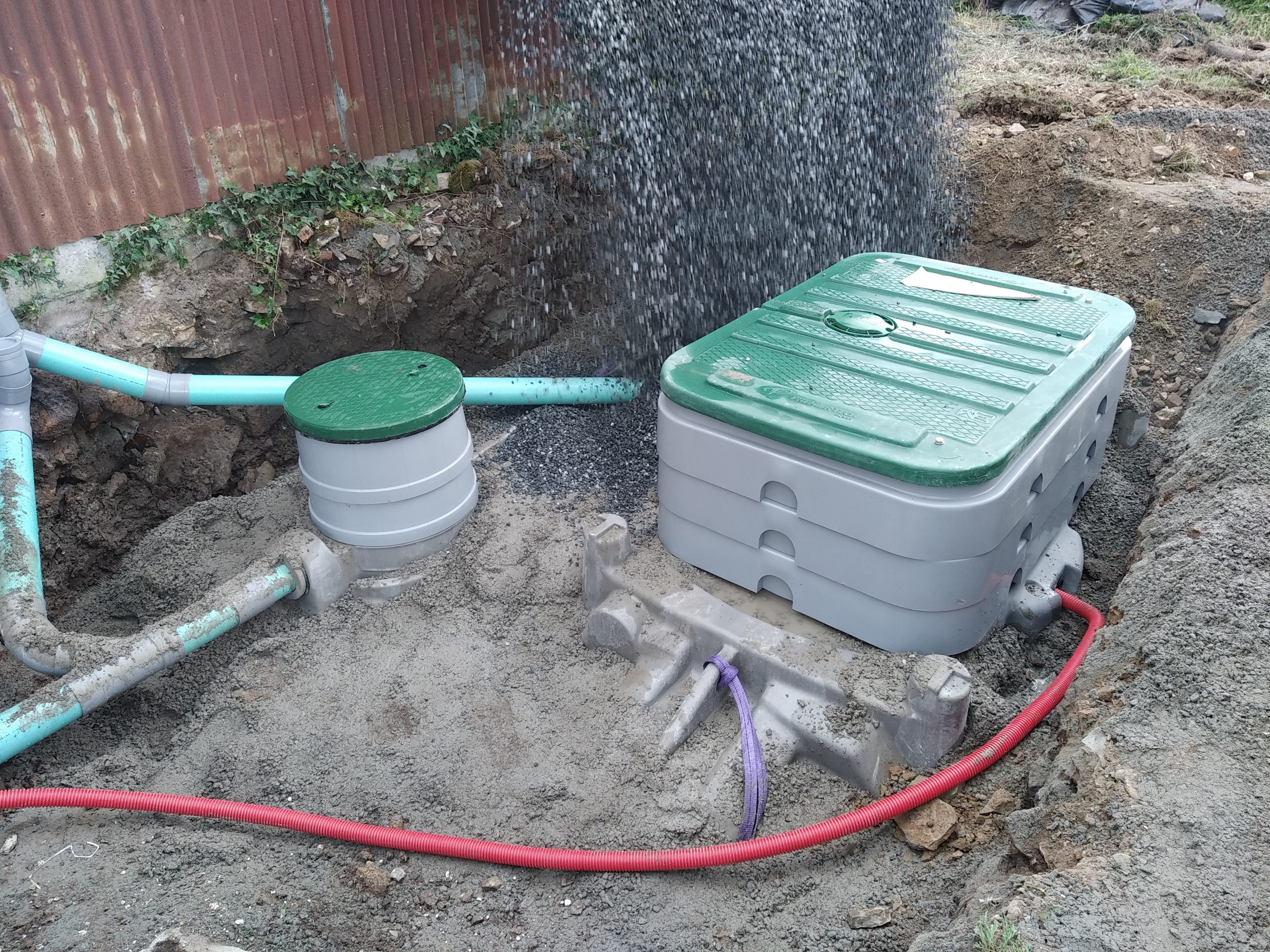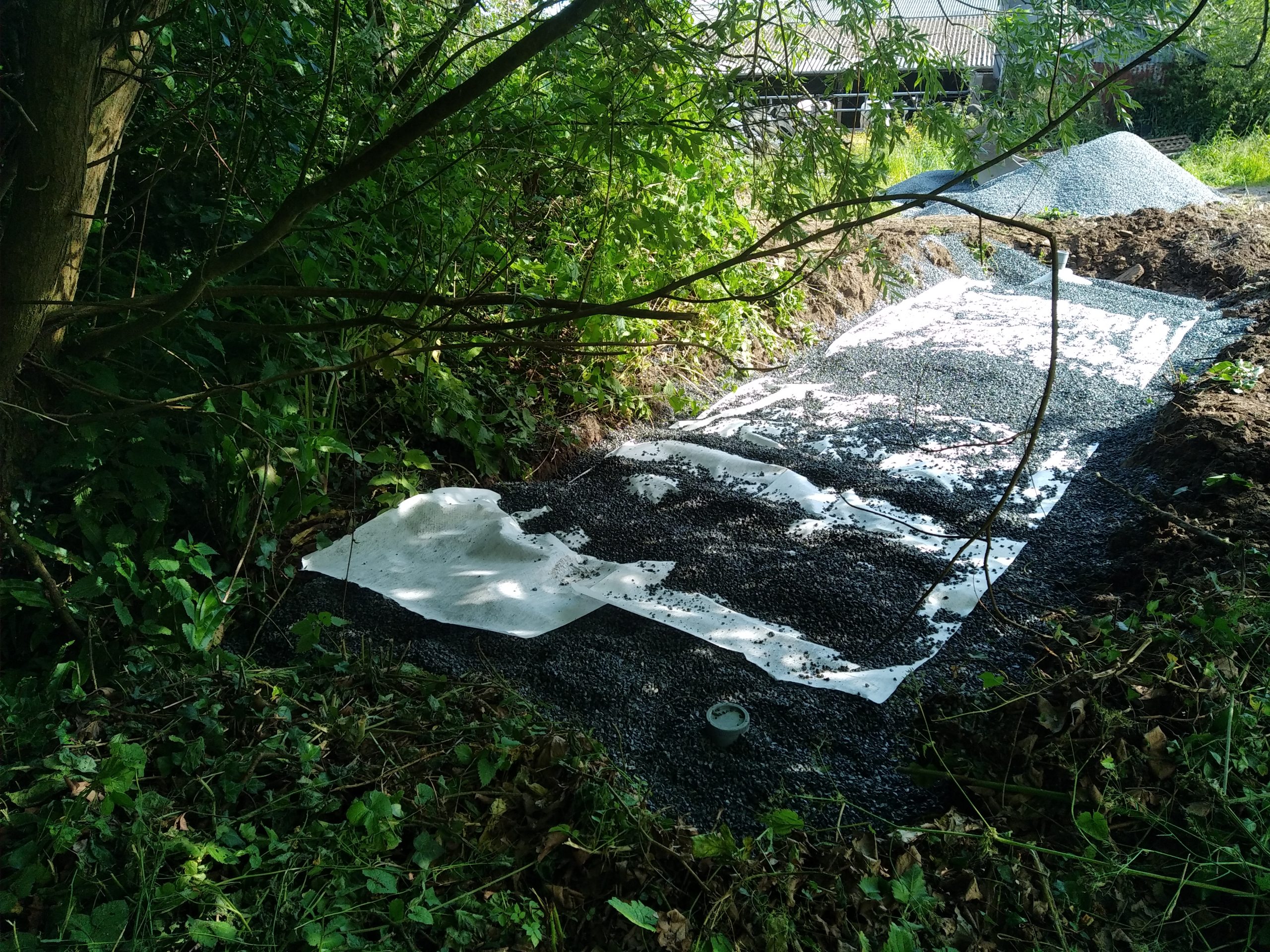 Avec un sol argileux, lourd et hydromorphe à très faible profondeur, les cuves sont posées sur un lit de béton et remblayées latéralement avec du béton dosé à 250 Kg de ciment par m3. La finition en surface est réalisée avec du gravier 6-10 mm.