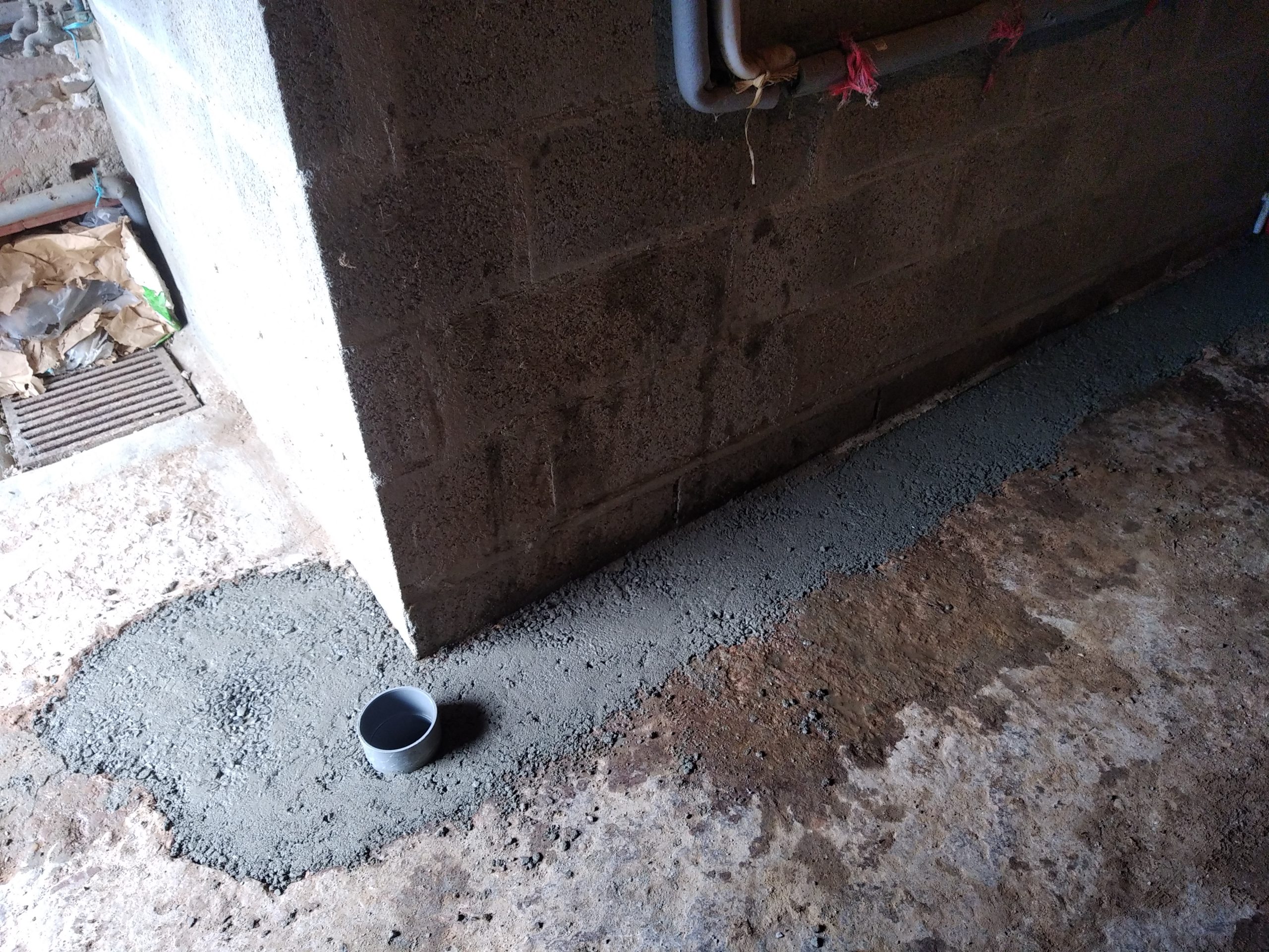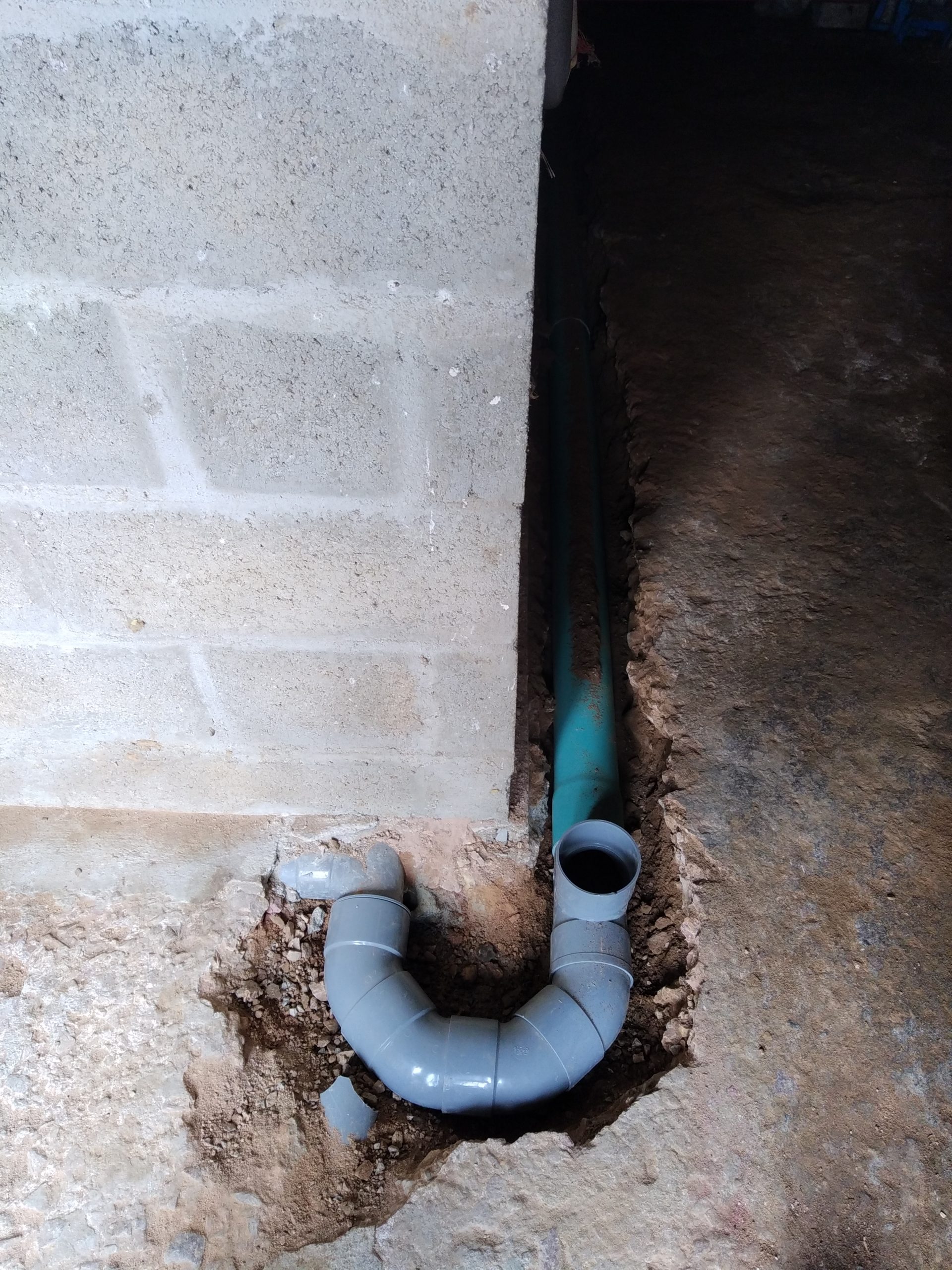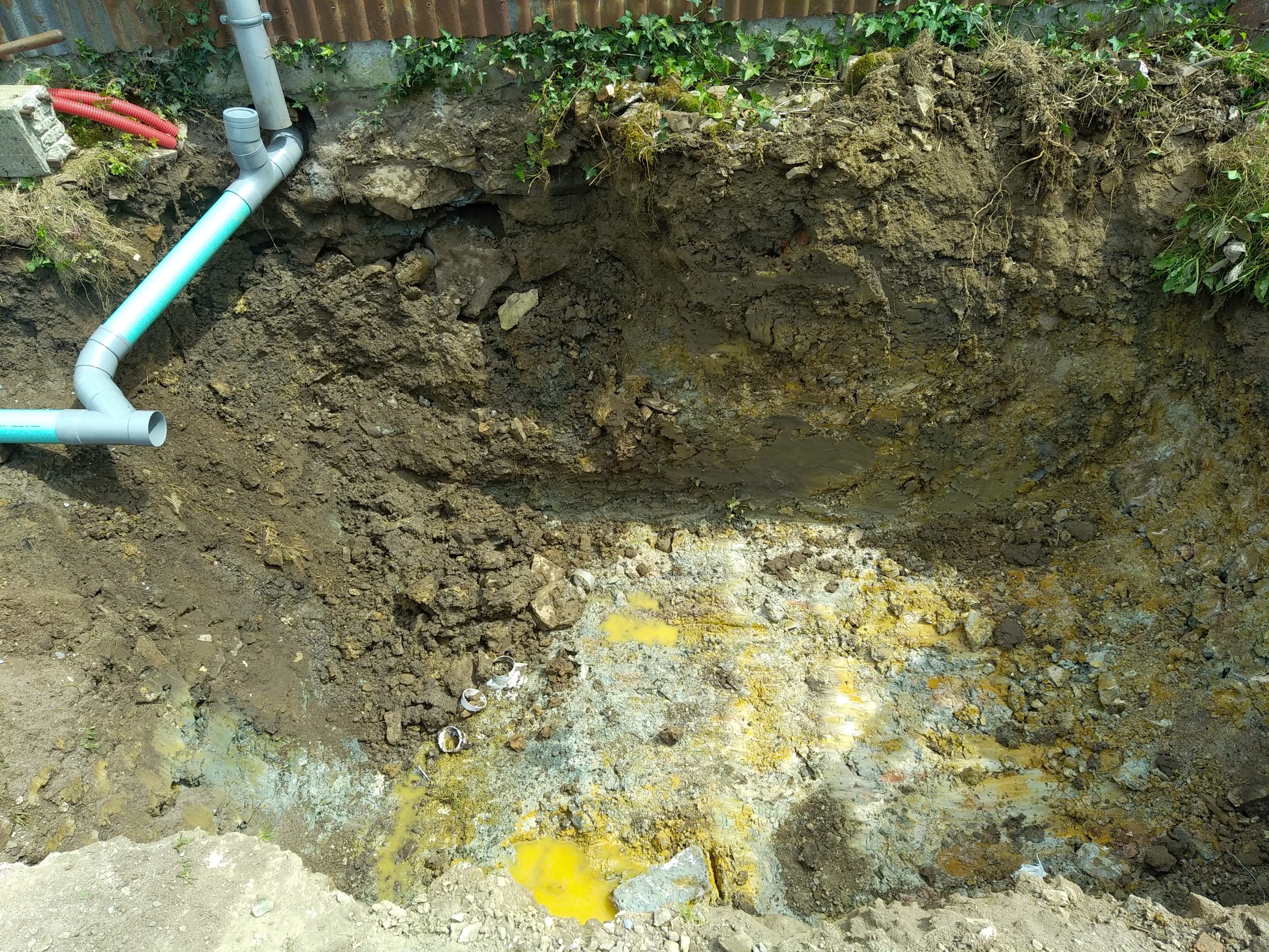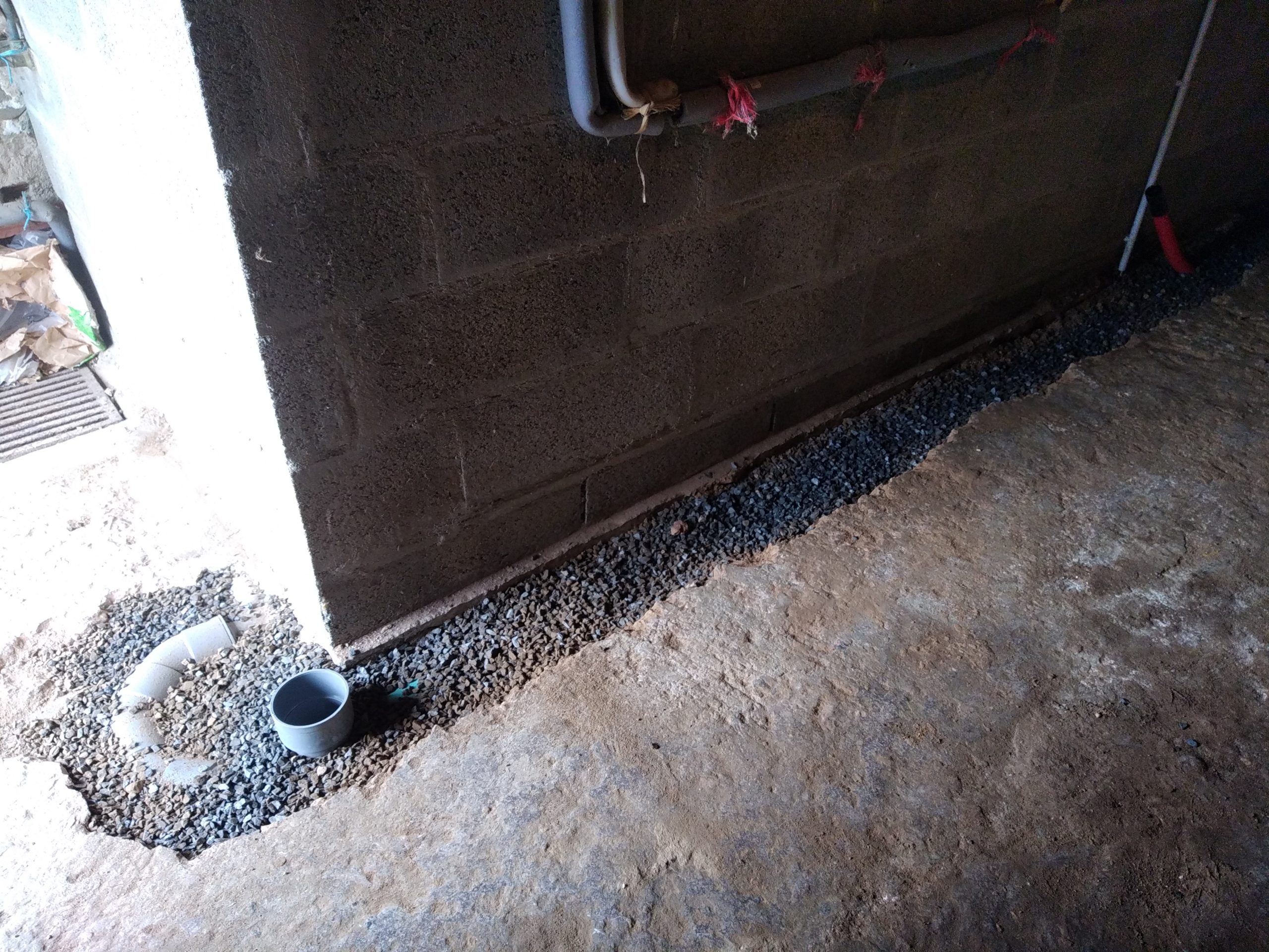 Avec un sol argileux, lourd et hydromorphe à très faible profondeur, les cuves sont posées sur un lit de béton et remblayées latéralement avec du béton dosé à 250 Kg de ciment par m3. La finition en surface est réalisée avec du gravier 6-10 mm.