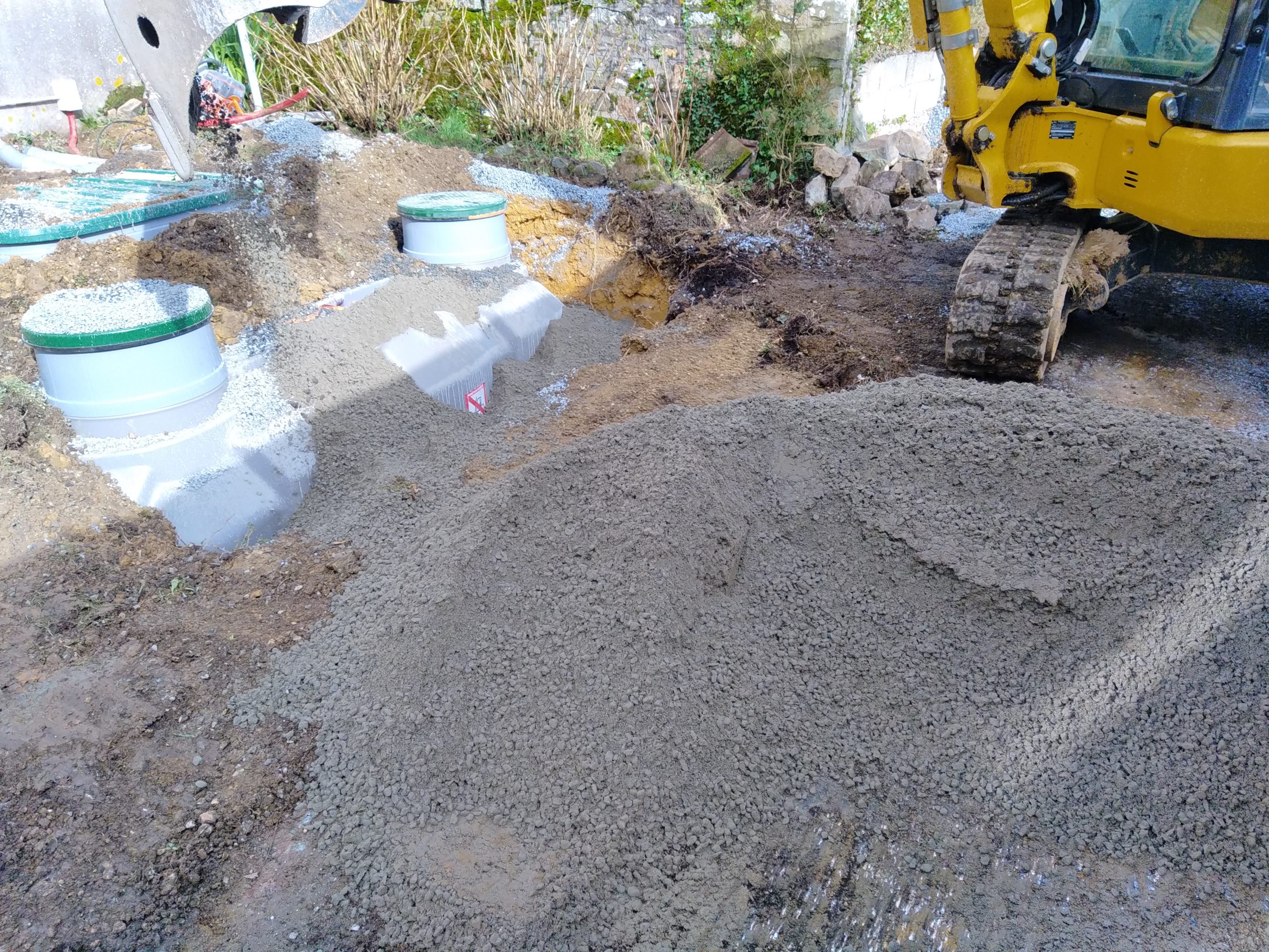 Une petite voirie communale étant située à 2 mètres seulement, et malgré le fait qu’elle soit plus basse, empêchant ainsi tout passage de véhicules sur le procédé épuratoire ECOFLO, un remblaiement latéral en béton est tout de même réalisé, selon nos prescriptions, à 250 Kg/m3, et par simple précaution.