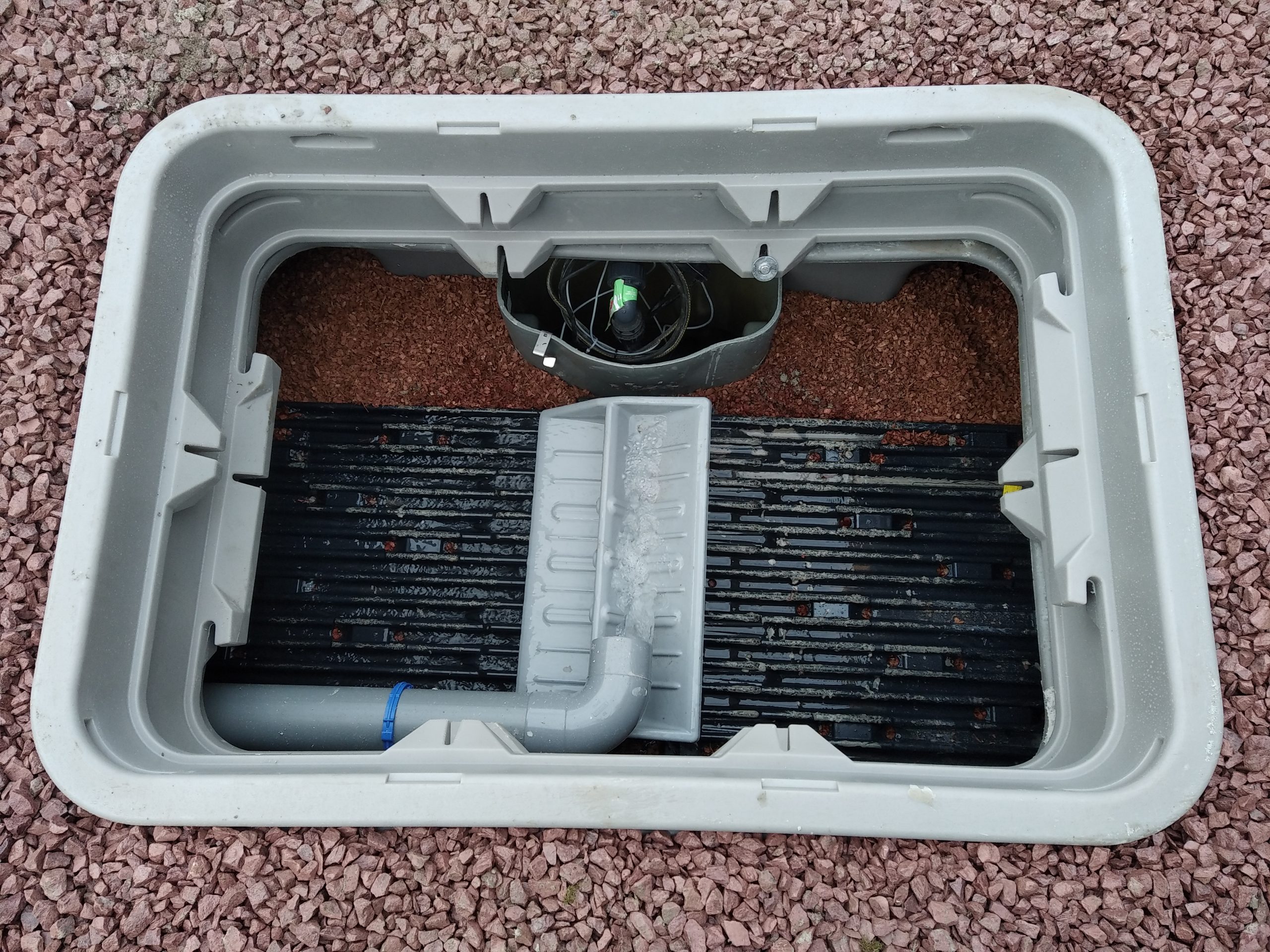 Pose d’un filtre compact ECOFLO PE2 pack 5 EH, sortie haute, équipé d’une pompe Pedrollo Top 3.