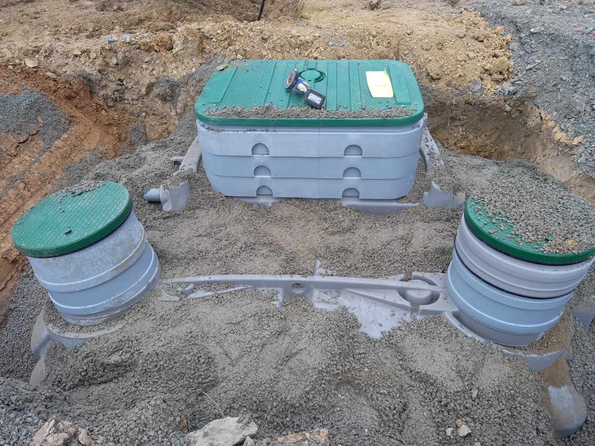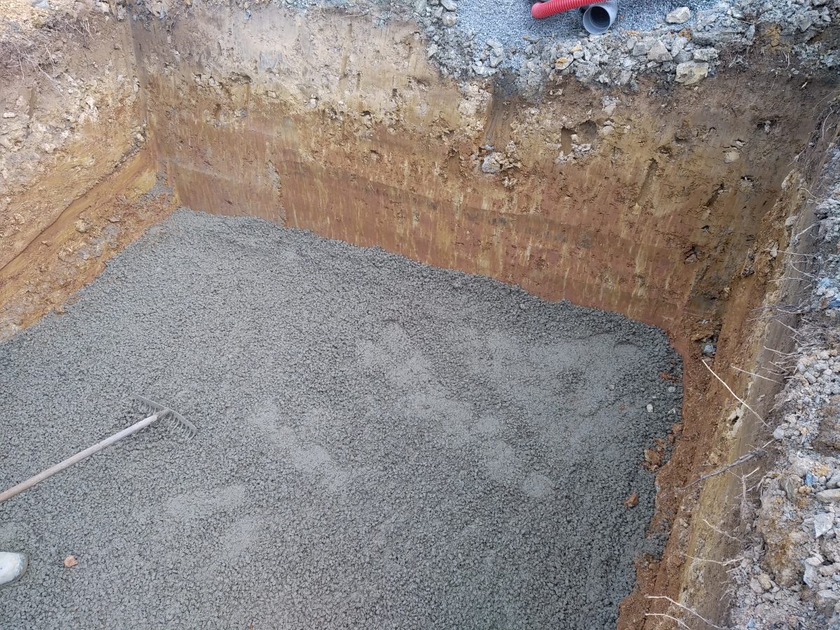 Avec un sol argileux et fortement hydromorphe à très faible profondeur, ce procédé épuratoire est ancré avec du béton dosé à 250 Kg de ciment par m3.