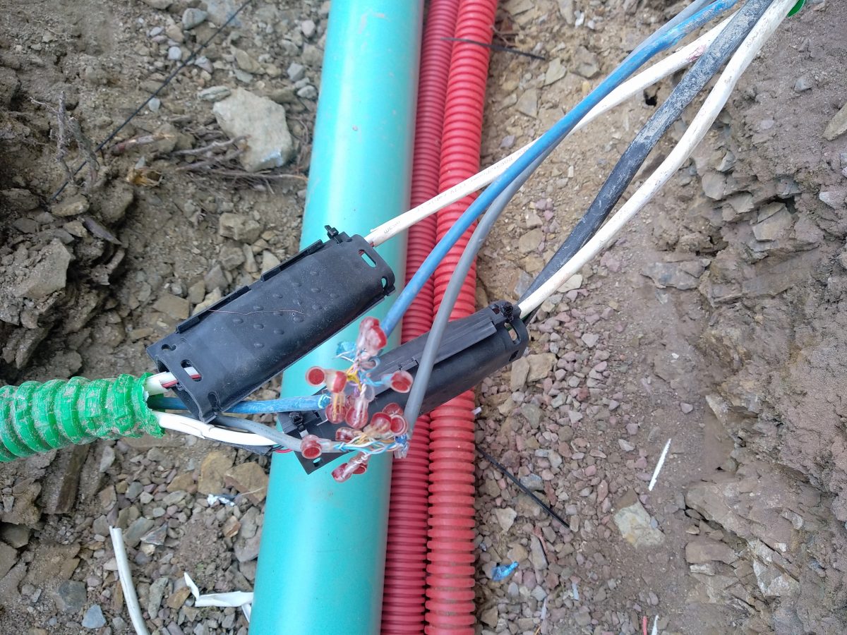Un exemple ici avec un réseau dédié à des caméras de surveillance. La réparation est effectuée à l’aide de scotchlock, wago, et 3 sous marins CELLPACK IP 68, le tout logé dans une bote de protection avant remblaiement.