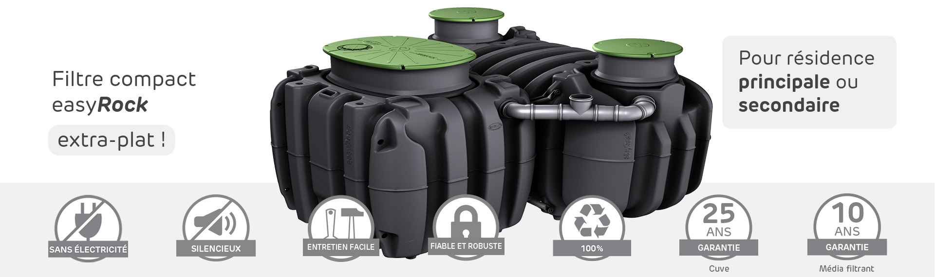 « Le filtre compact Graf esayRock est certainement l’une des meilleures versions de filtre compact du marché, issu d’une longue recherche. Ce dispositif de traitement des eaux usées domestiques fonctionne de façon gravitaire, sans consommation d’électricité, par simple percolation des eaux usées dans un massif composé de laine de roche. La laine de roche reste aujourd’hui le meilleur support bactérien avec la plus grande porosité, soit 98%, bien supérieur aux autres média tels que la coco, les coquilles de noisettes, le Xylit …
