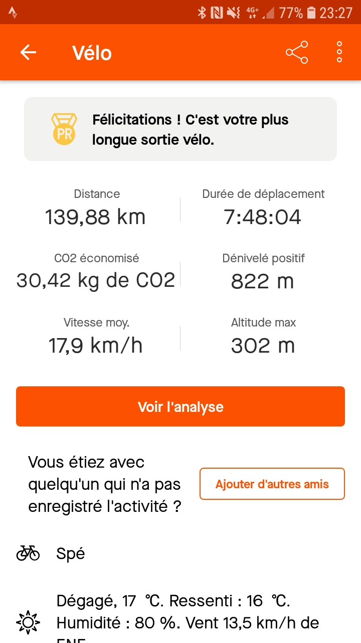 » 5 006 790 mètres de distance sans ma voiture. Pour un dénivelé positif de 48 545 m, soit plus de 48 km de grimpette ! Les côtes sont parfois difficiles, mais c’est comme chaque difficulté qu’on rencontre dans la vie, on adapte sa vitesse, et, un coup de pédale après l’autre, en acceptant que cela prenne du temps, on finit par arriver en haut !