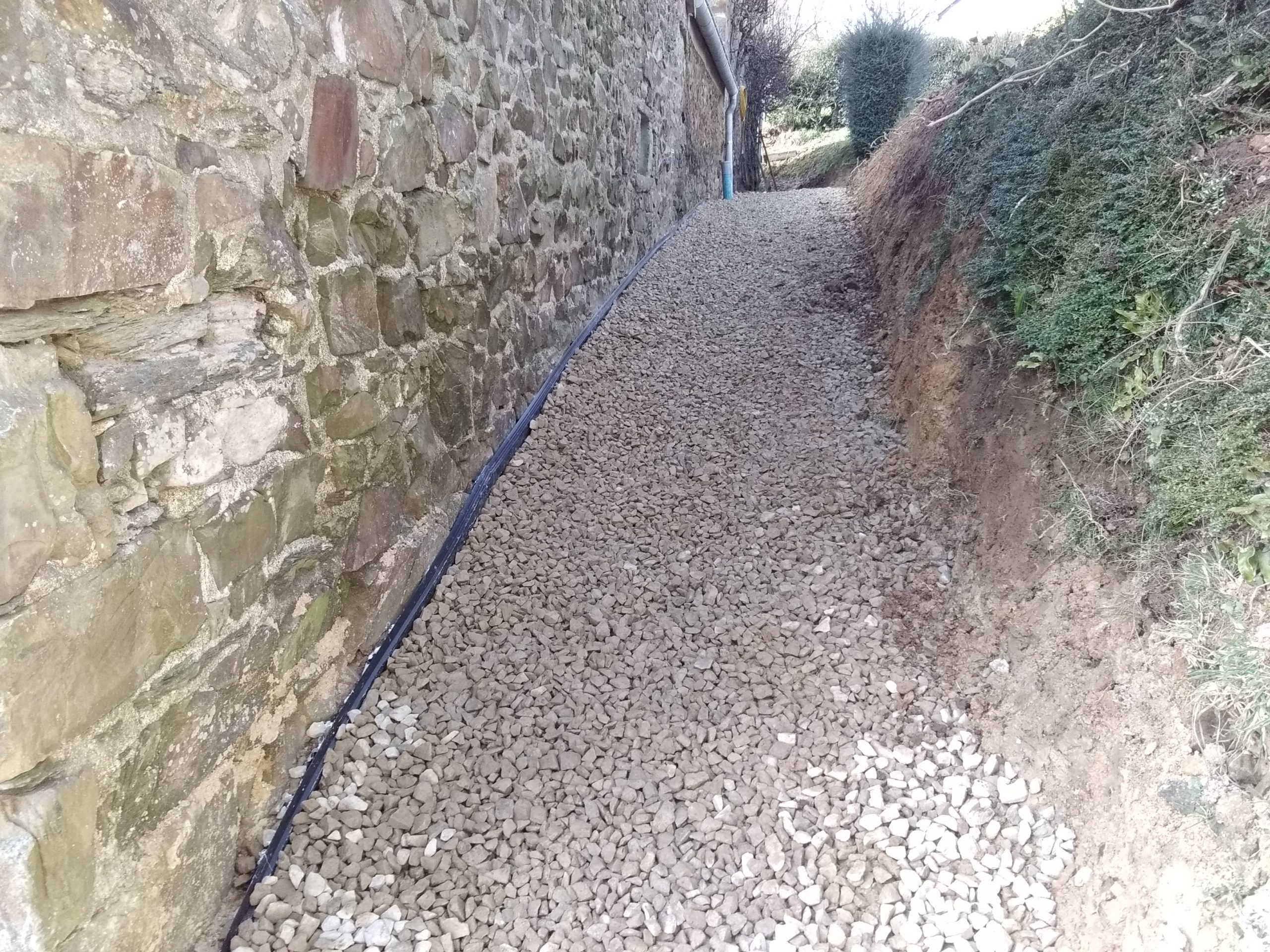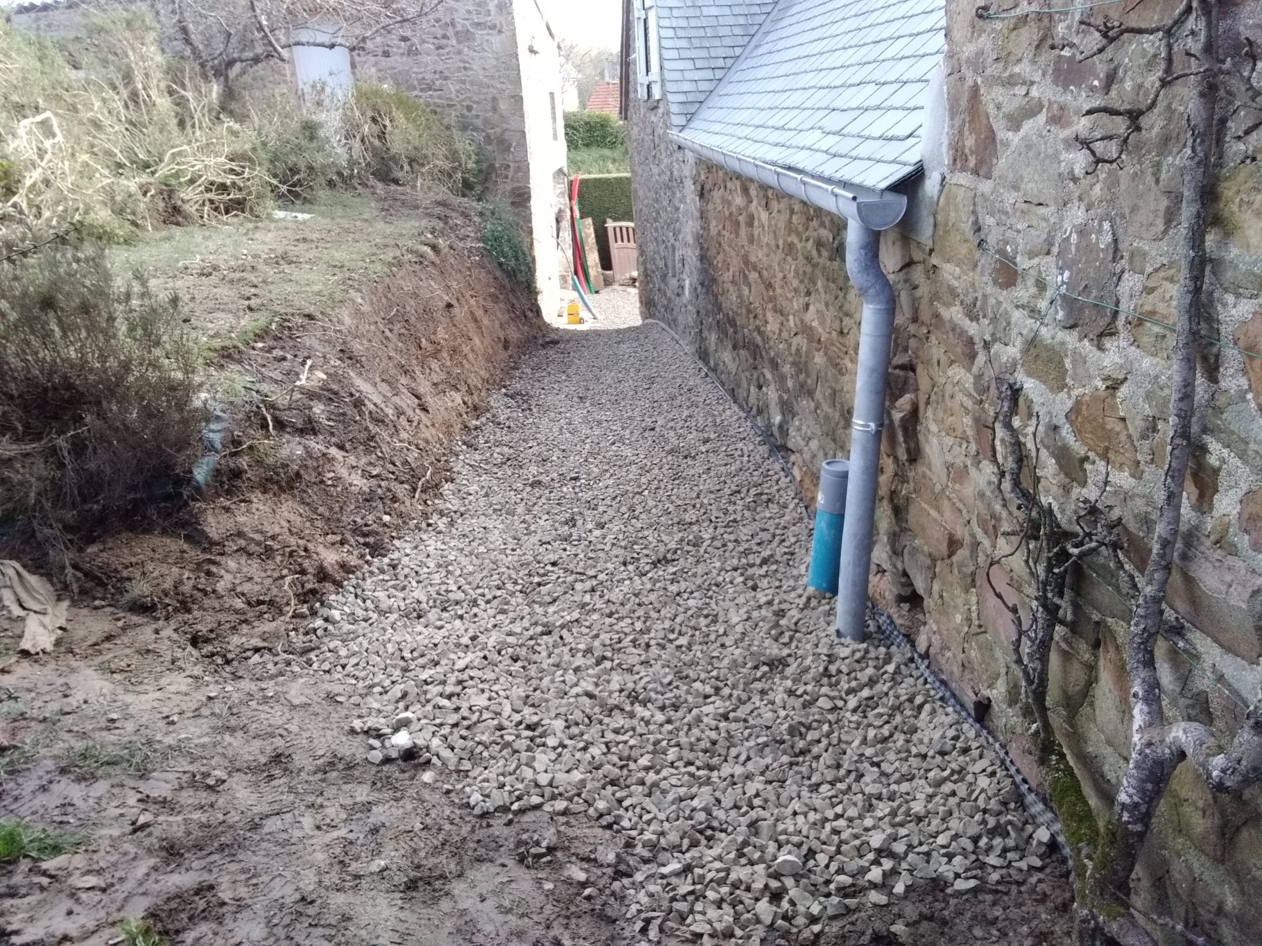 Une géo-membrane, de type géo-espaceur (Delta-MS) est posée le long de la paroi à protéger, jusqu’à 30 cm en dessous du niveau de la dalle, avec un replis. Le drainage est assuré par des tuyaux epandrain type CR4 D100 mm, noyés dans du gravier 20/40 mm dépourvu de fines.