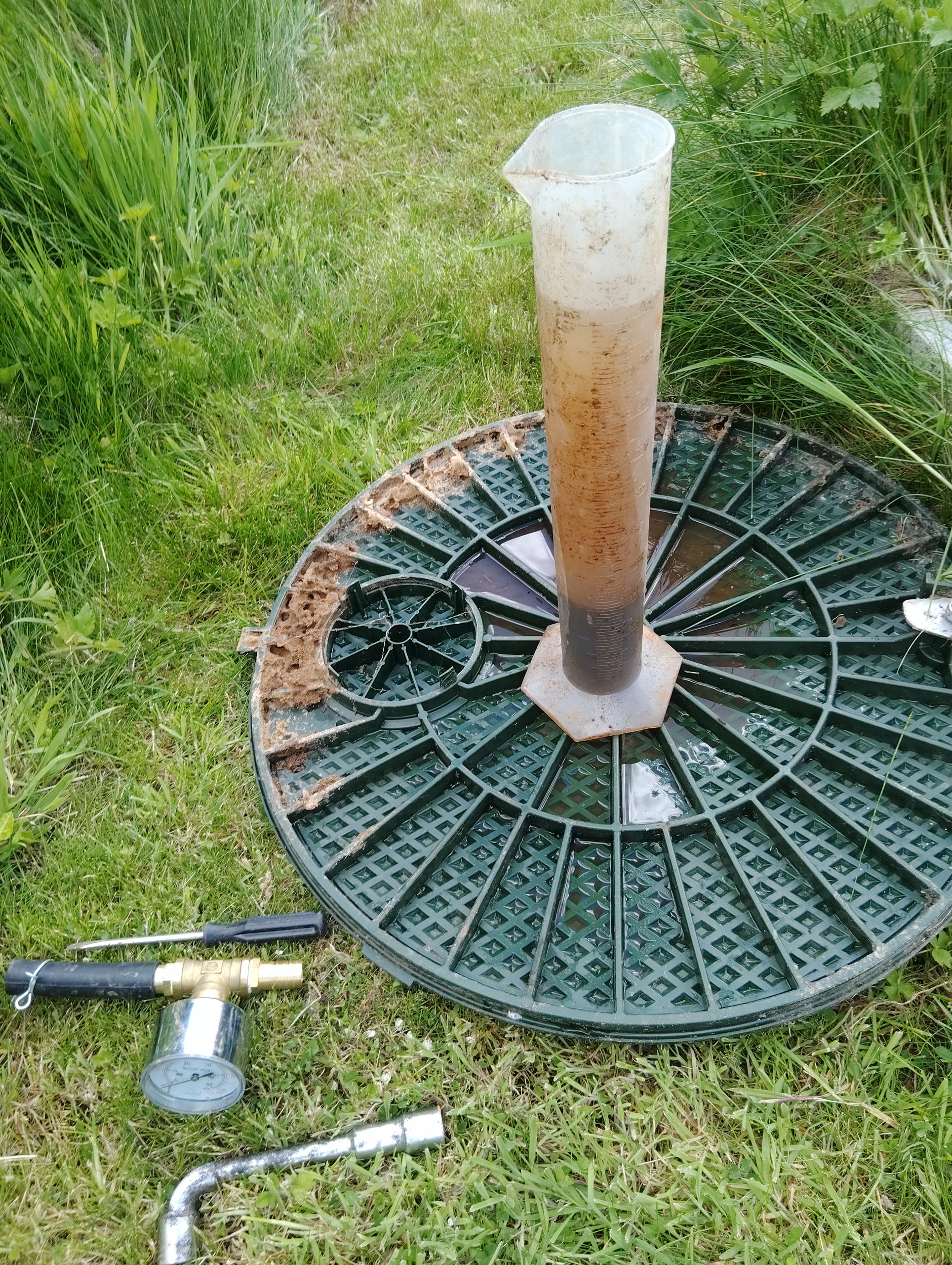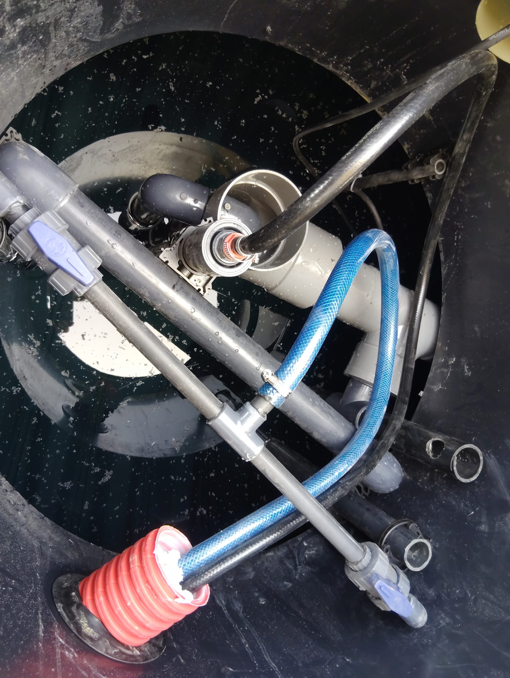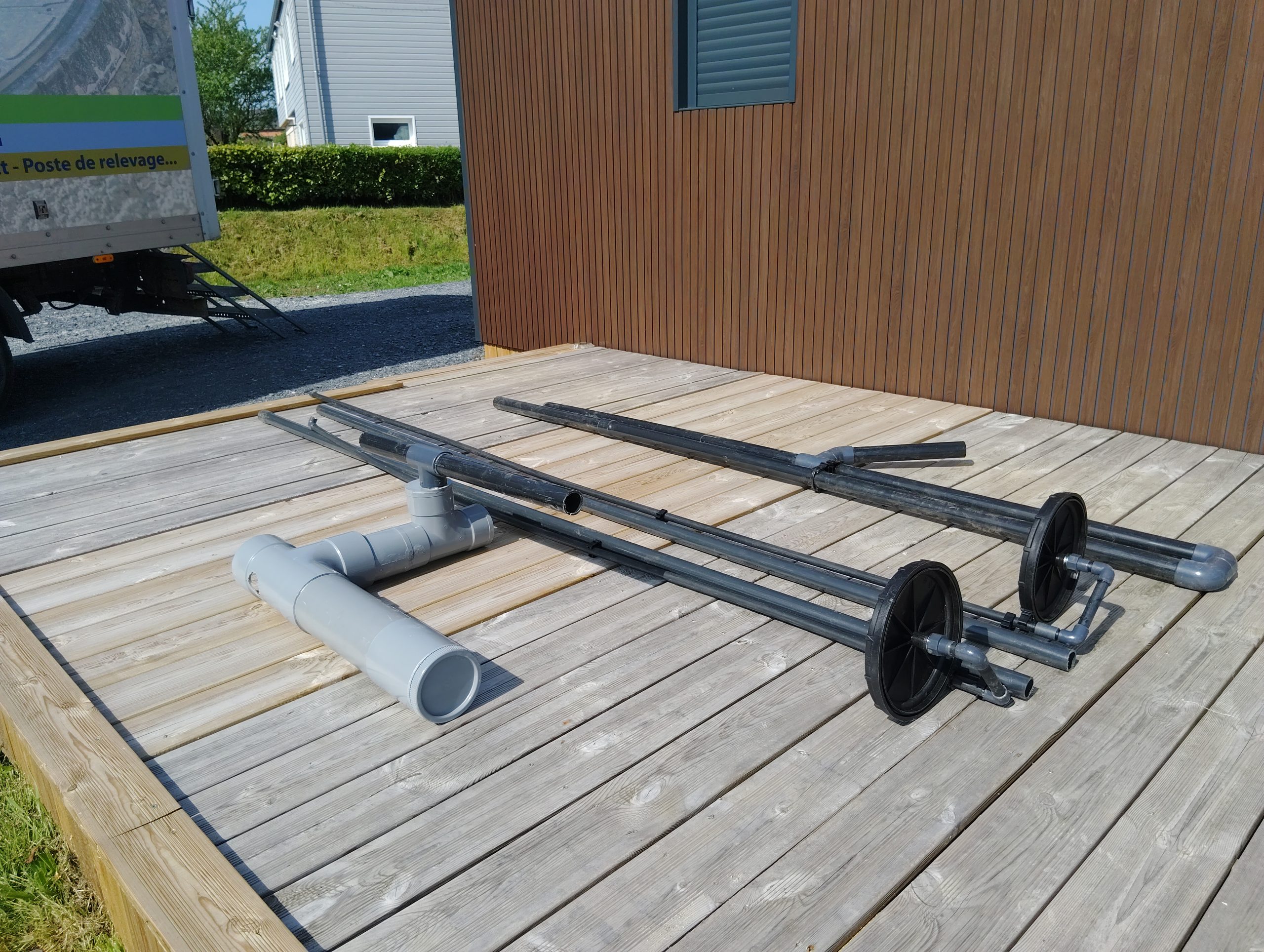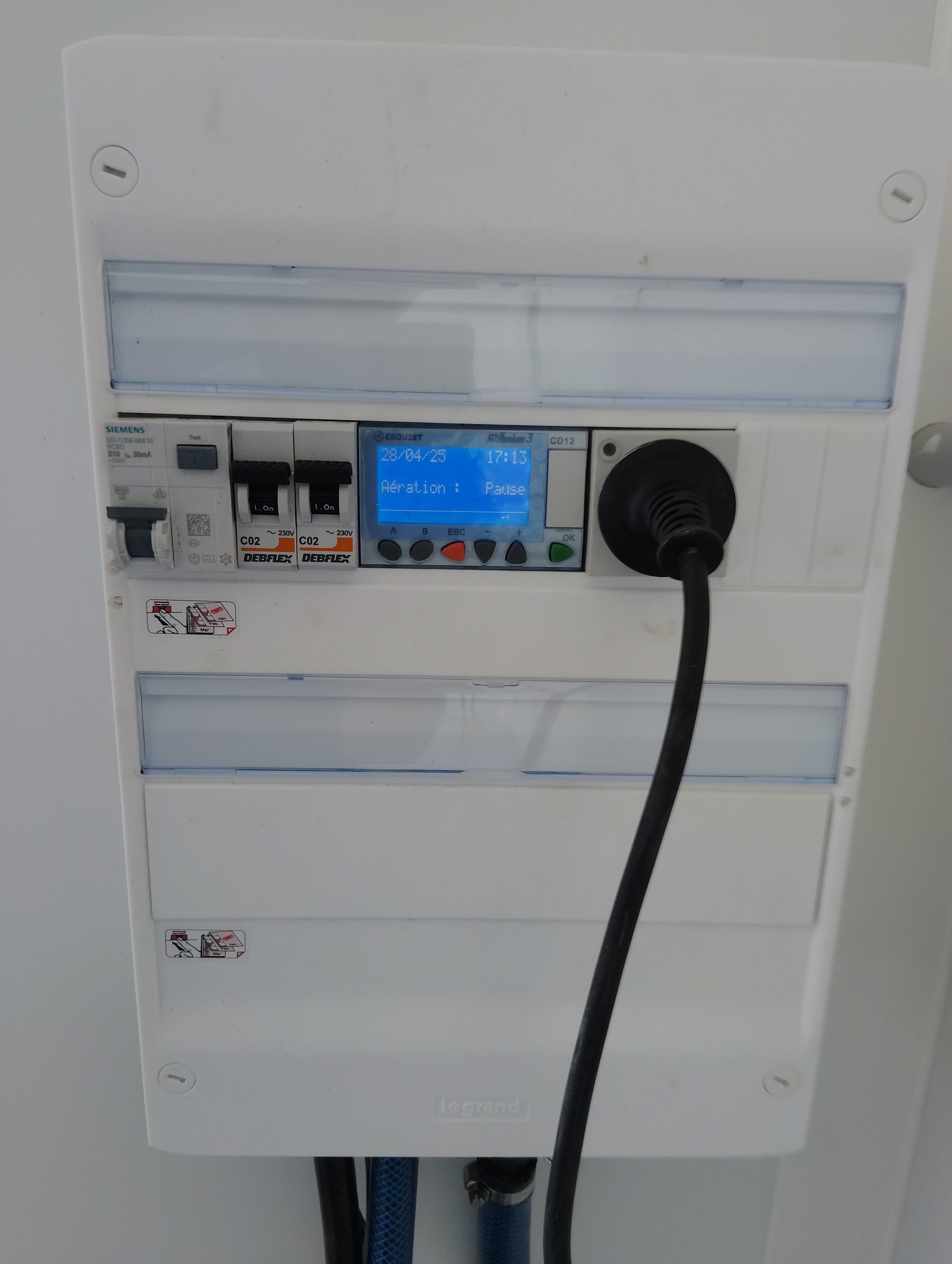 Cette installation, avec une cuve Graf Carat 4800 Litres, permet un stockage et un traitement quotidien d’effluents de 2400 Litres. Le prélèvement de la colonne air lift du pompage d’évacuation est donc placé à mi hauteur.