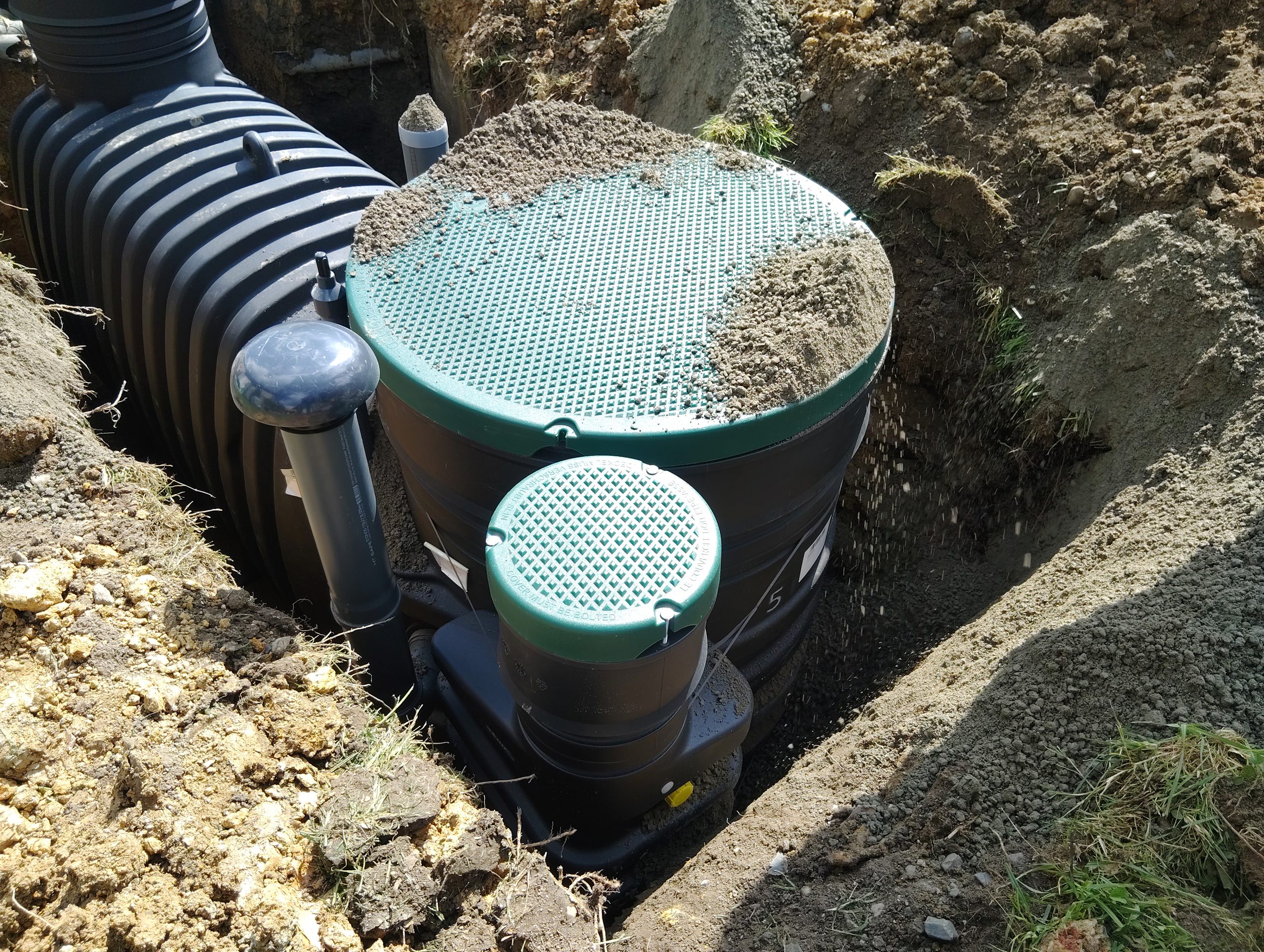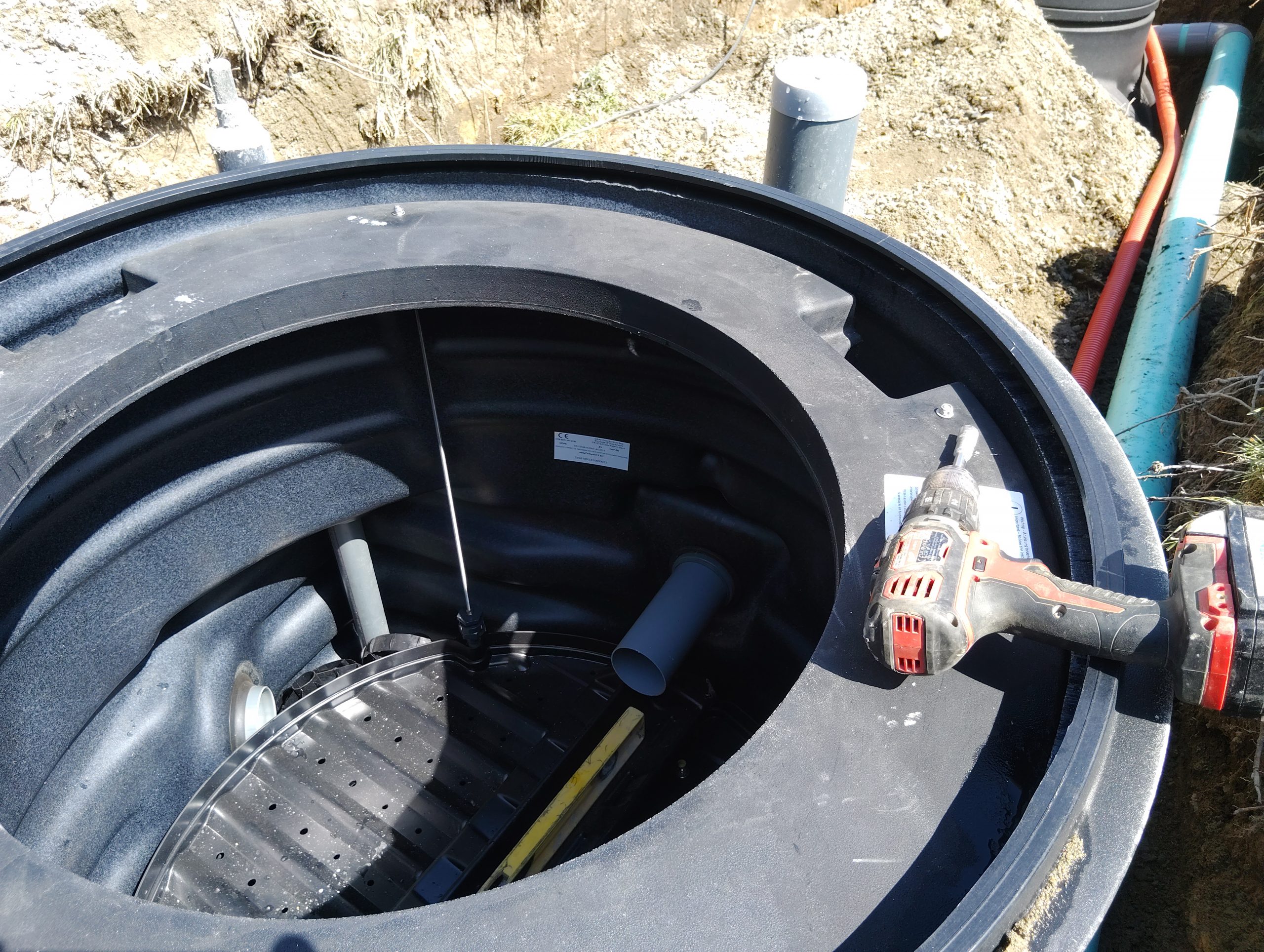 Une micro station d’épuration GRAF easyOne 5 EH est alors installée. Les eaux ainsi traitées sont évacuées, à l’aide d’un poste de relevage, conçu sur-mesures, par infiltration dans le sol et contenue sur la parcelle. Nous retiendrons la pompe Pedrollo TOP1 GM, à faible encombrement, à flotteur magnétique vertical, pour ce refoulement.