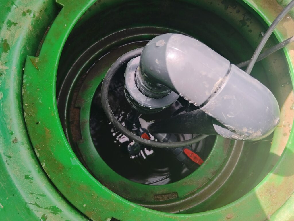 Cette intervention est assez technique car le terrassier a jugé bon de placer 2 rehausses sur le poste de relevage, sans remonter la colonne de pompage … La vanne union de démontage est quasiment hors de portée ainsi que le raccord électrique. Curieusement, ce terrassier n’exerce plus.