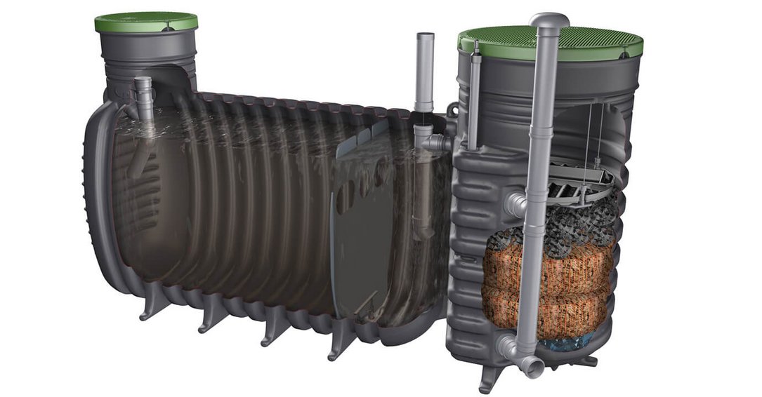 | Composition : | 1 cuve divisée en 3 compartiments : • compartiments 1 et 2 pour la partie fosse toutes eaux et préfiltre de 3 179 L • compartiment 3 pour le filtre compact avec média filtrant GRAFROCK de type laine de roche et 0,84 |