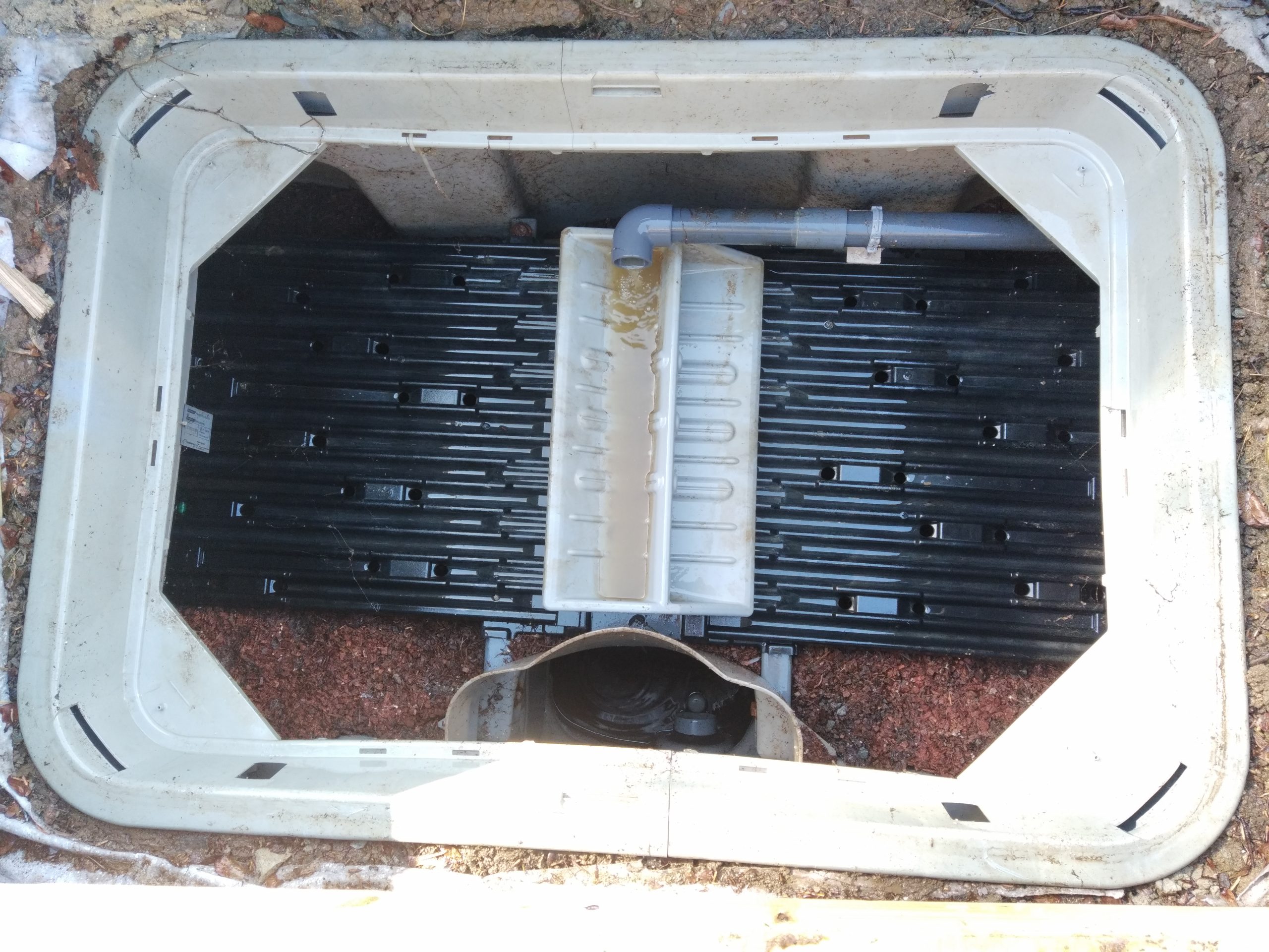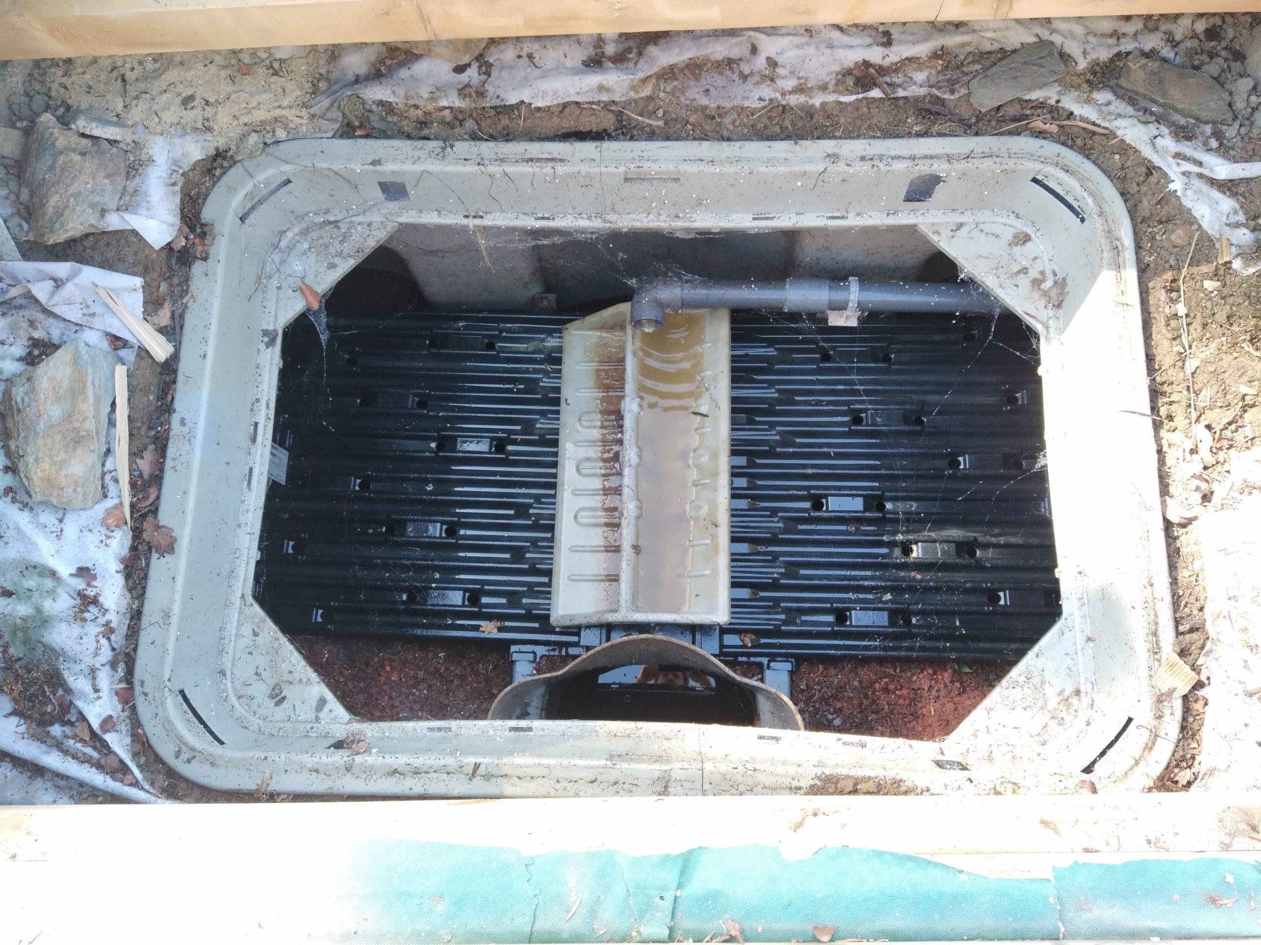 Nous intervenons aujourd’hui pour l’entretien d’un filtre compact ECOFLO PE2 pack 5 EH Sortie basse. Ce dispositif d’assainissement des eaux usées domestiques a été placé sous une terrasse. Cela reste réglementaire, sous ces conditions :