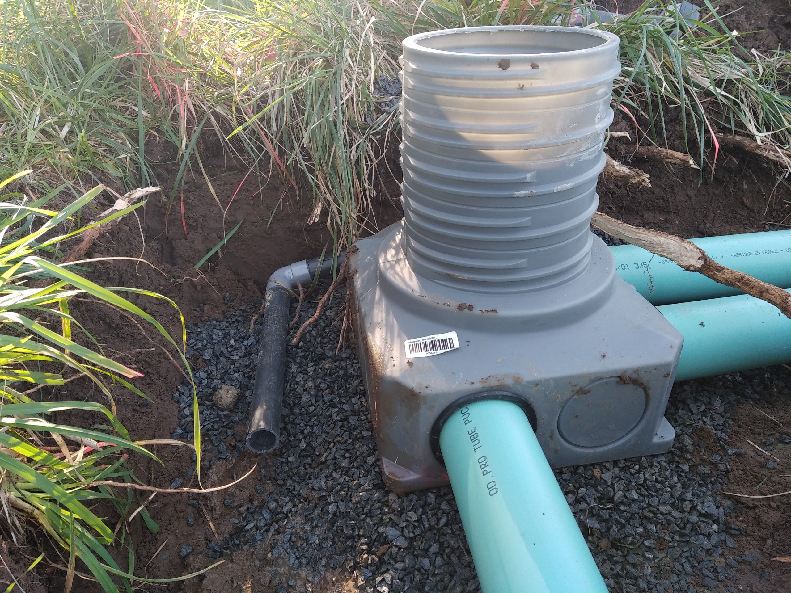 C’est alors qu’intervient le brise jet pour une répartition équitable des effluents dans l’ensemble des tranchées. Ce système reste simple à réaliser avec un coude PVC D40 mm, dirigé vers le bas et placé au centre du regard.