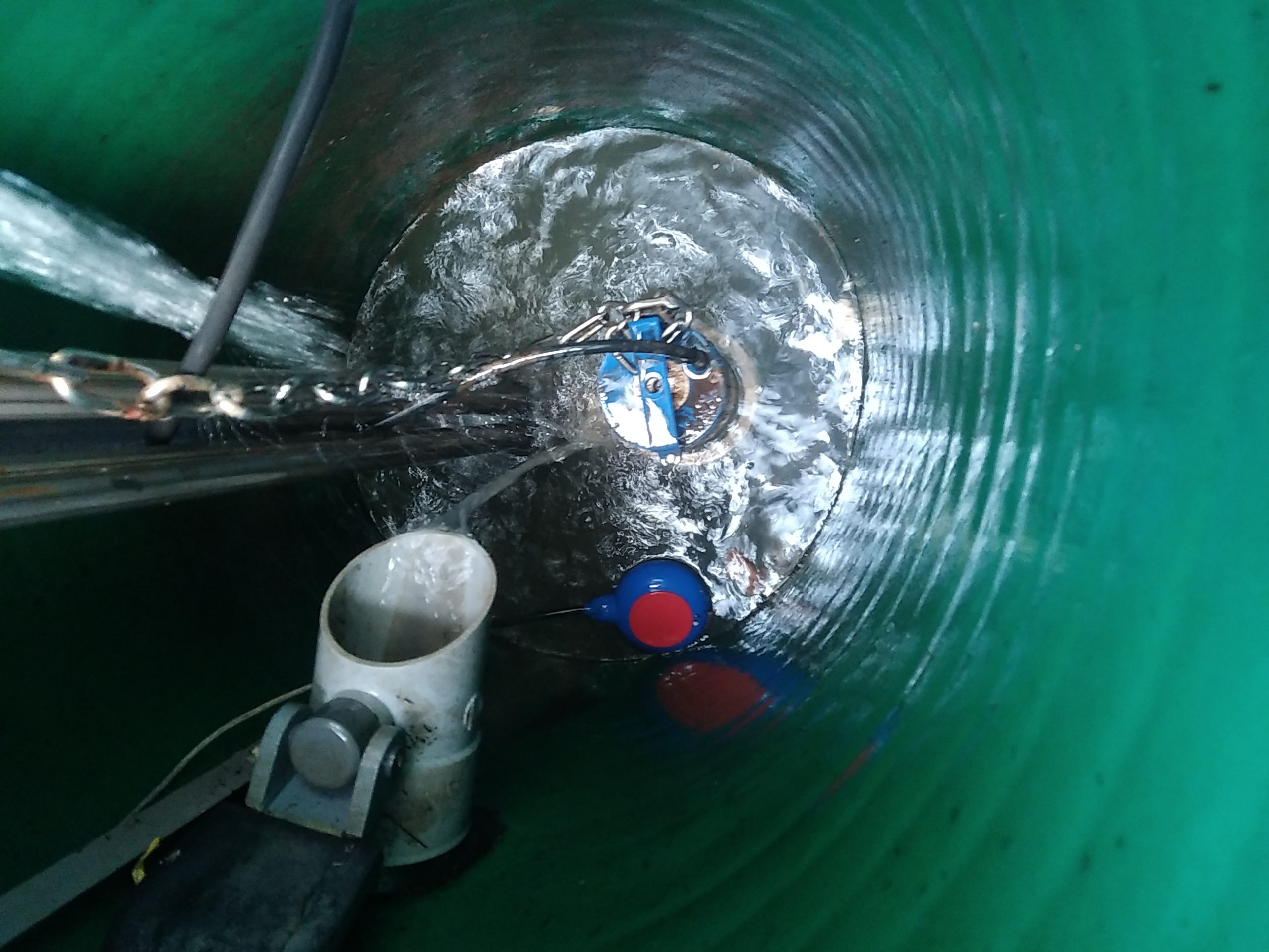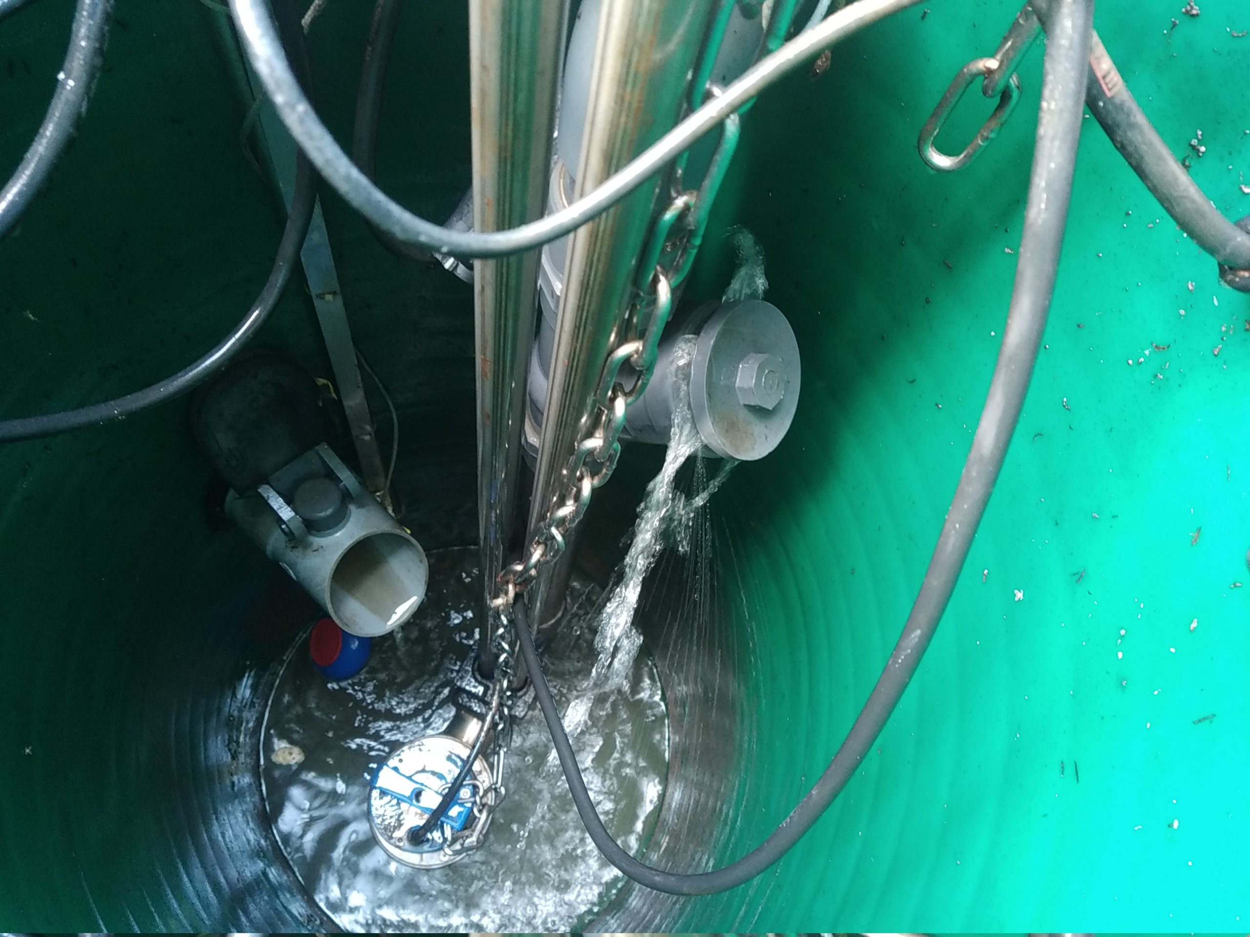 Après 5 minutes de vidange, nous pouvons continuer l’entretien avec l’extraction et le lavage de la pompe FLYGT DELINOX DXV50-7/B, l’extraction et le lavage des flotteurs, et le nettoyage du clapet et de la boule.