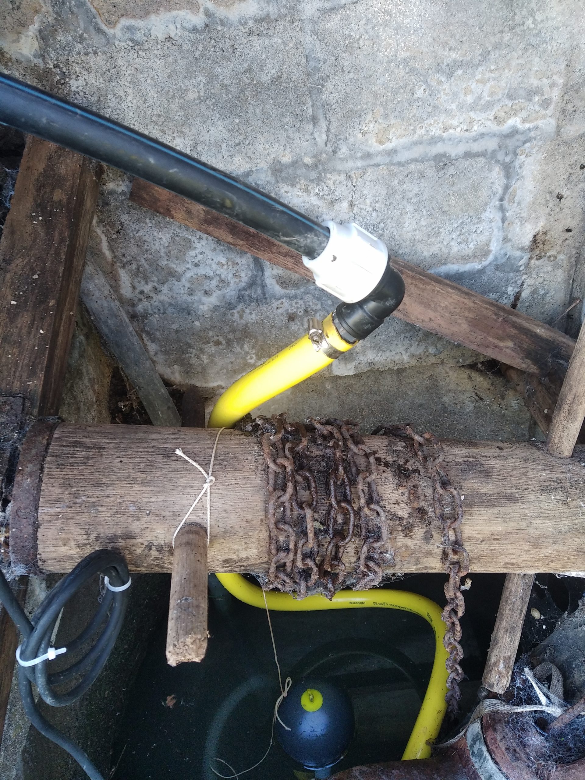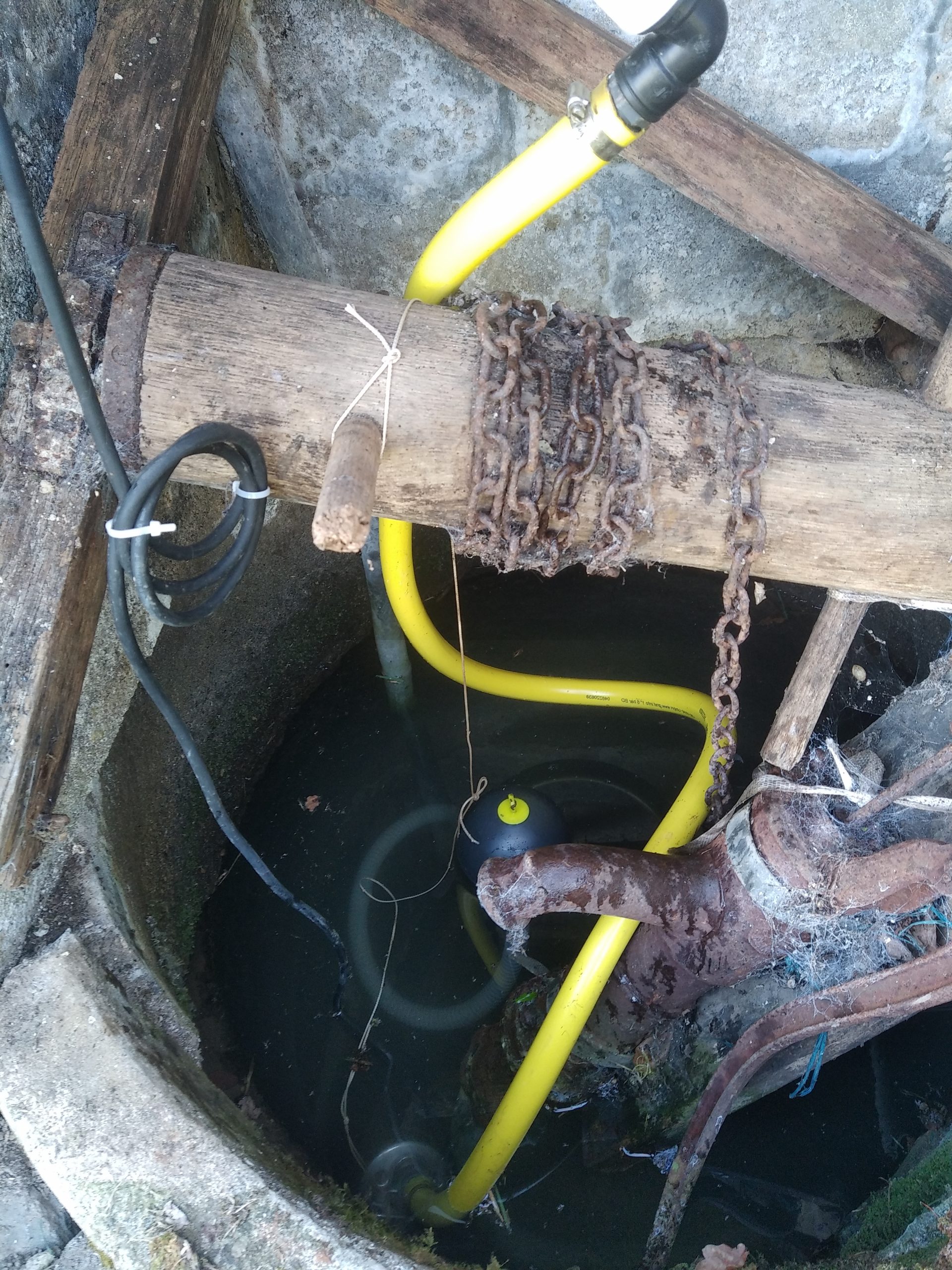 La pompe en place dans ce petit puits de surface était une pompe DAB Divertron, dont l’installateur avait fait preuve d’originalité pour le montage, avec une crépine directement vissée en pieds de pompe, puis posée au fond, dans les sédiments …
