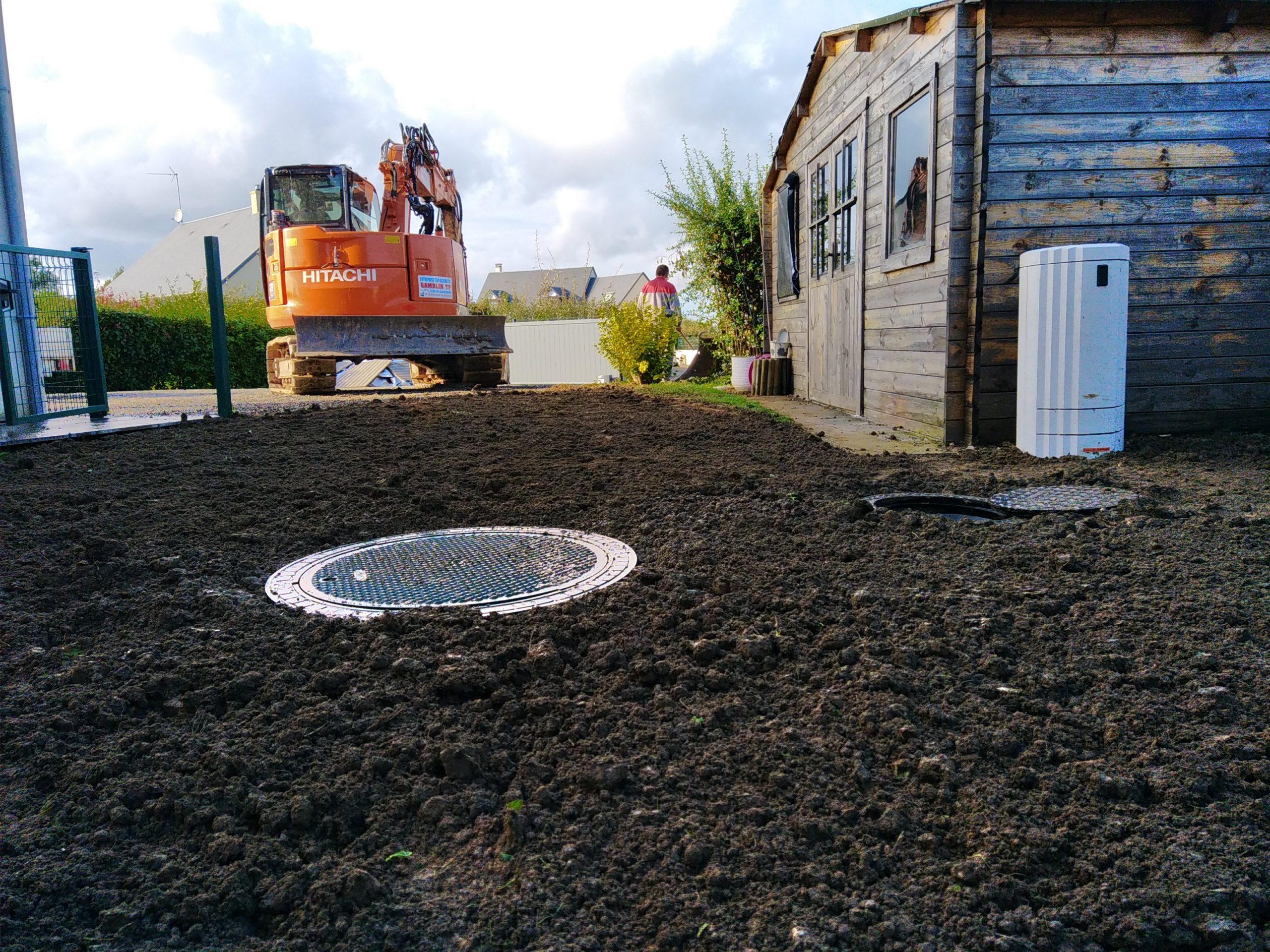 Pose d’une micro-station d’épuration Graf EasyOne 7 EH, avec GAMBLIN TP, à Saint-Jean-des-Champs (50320), dans un espace très réduit : 25 m²