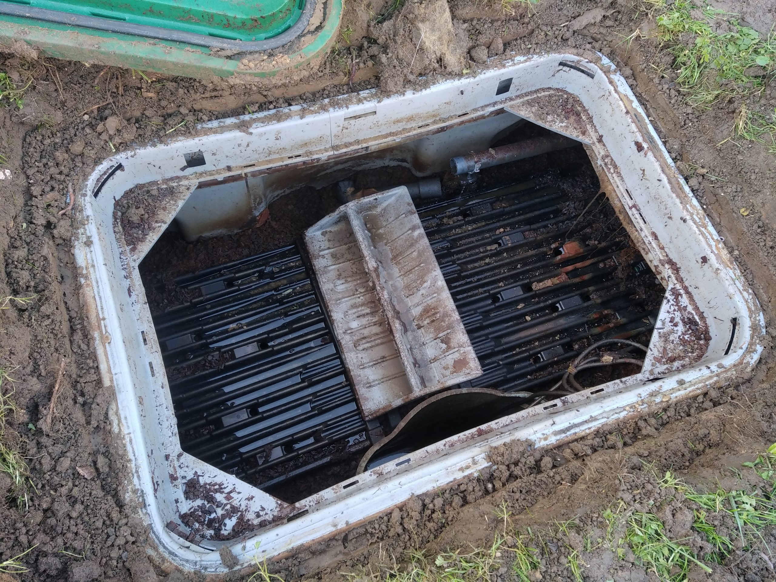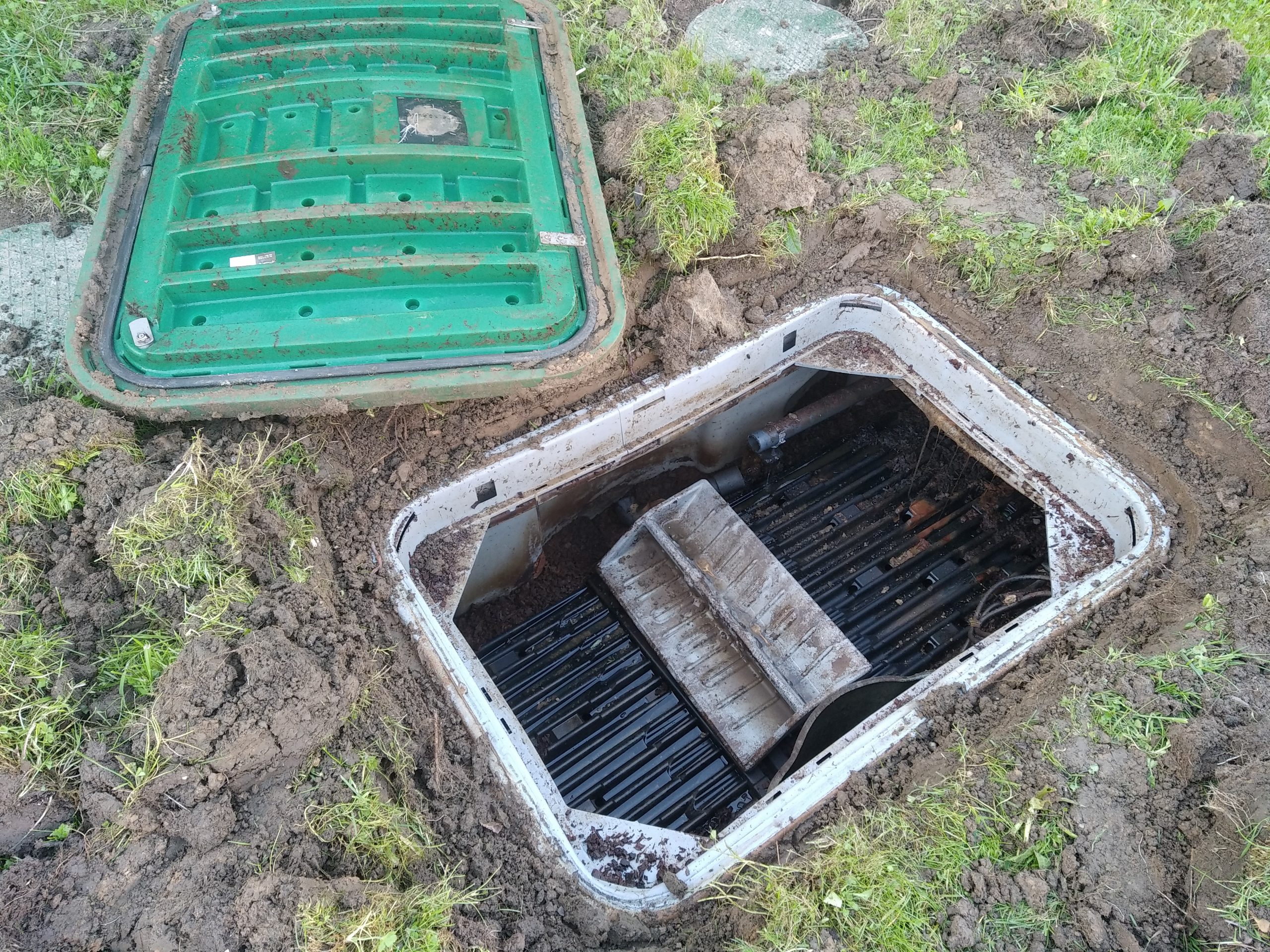 En effet, lors de notre arrivée, seuls les couvercles de la fosse toutes eaux sont visibles. Après 15 minutes d’effort, nous découvrons enfin le couvercle rectangulaire du filtre coco, enfoui sous 15 cm de terre.