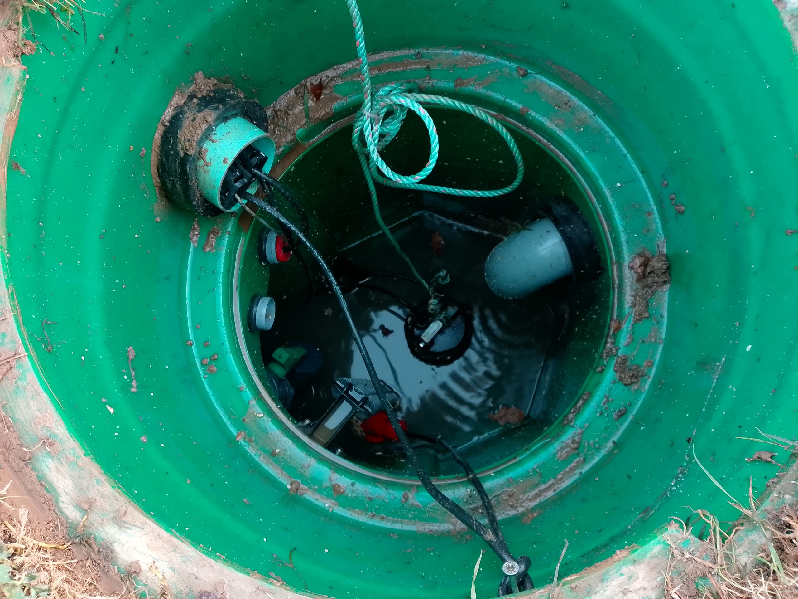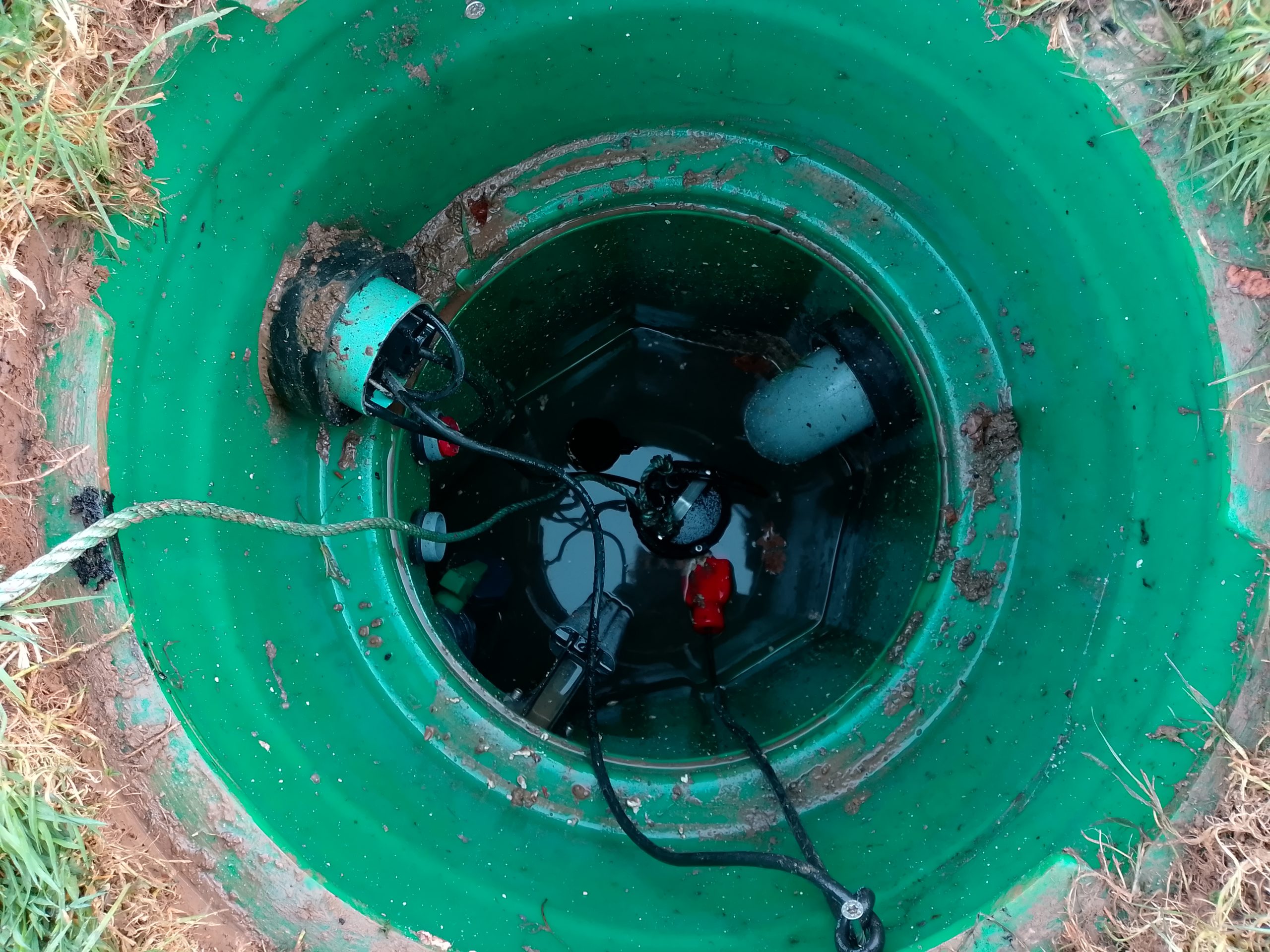 Nous intervenons alors rapidement. Sur place, nous identifions facilement le problème. La course du flotteur est trop longue. Il se loge alors dans un coin du poste de relevage, empêchant sa remontée et le déclenchement automatique de la pompe.