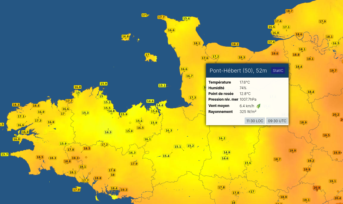 Ces prévisions sont établies pour 7 jours pour la région de Pont-Hébert 50880 ( Manche, Basse Normandie ) grâce au réseau « StatIC » de infoclimat.fr dont fait partie AQUAsoluces.