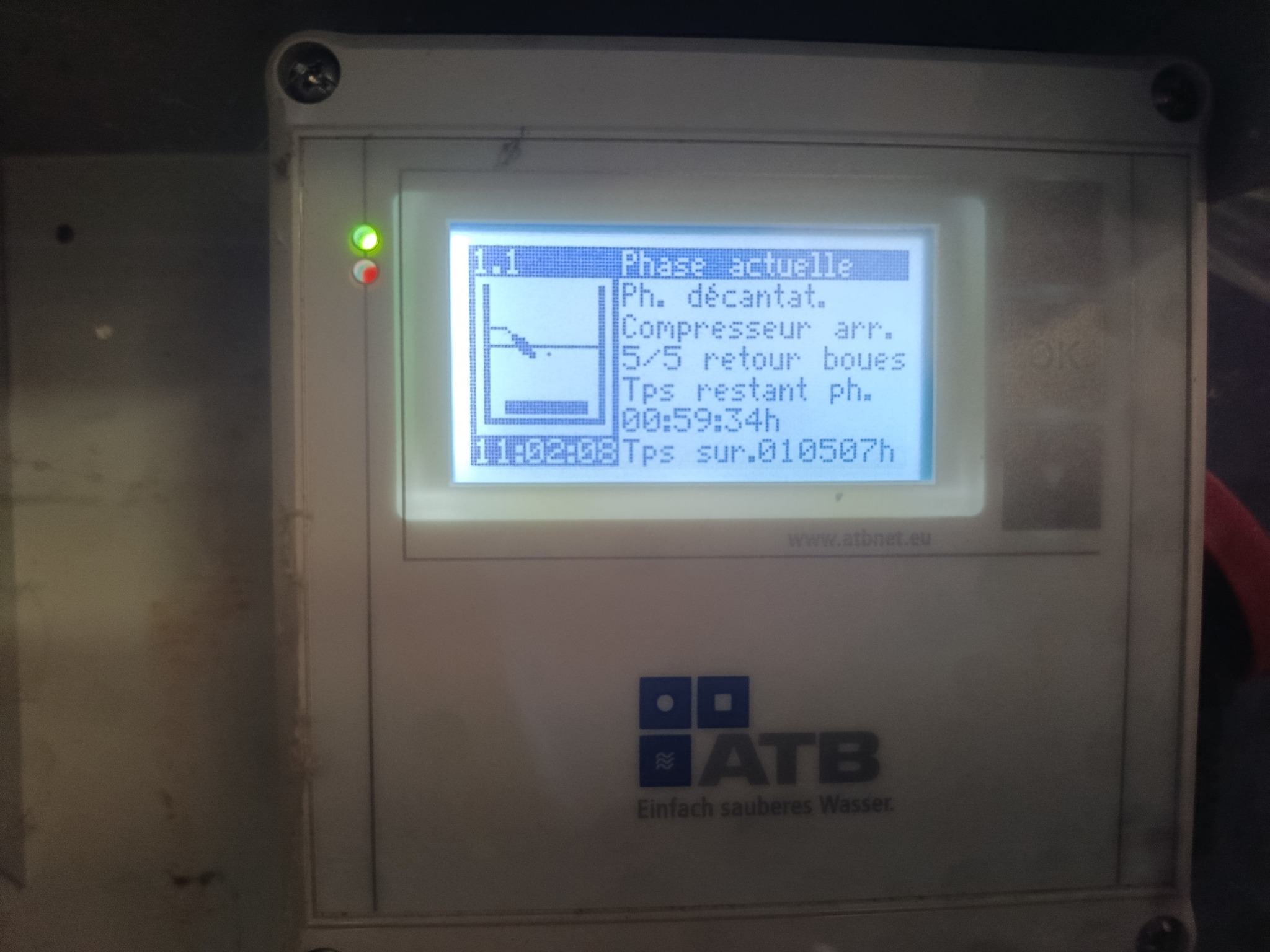 Après 1 heure de travail, et après quelques essais, tout est rentré en ordre, avec un flotteur en position basse, bien confirmé par l’automate. Le flotteur est aussi placé volontairement en position ‘niveau haut‘ pour vérifier la bonne détection par le boitier de commande ATB Control.
