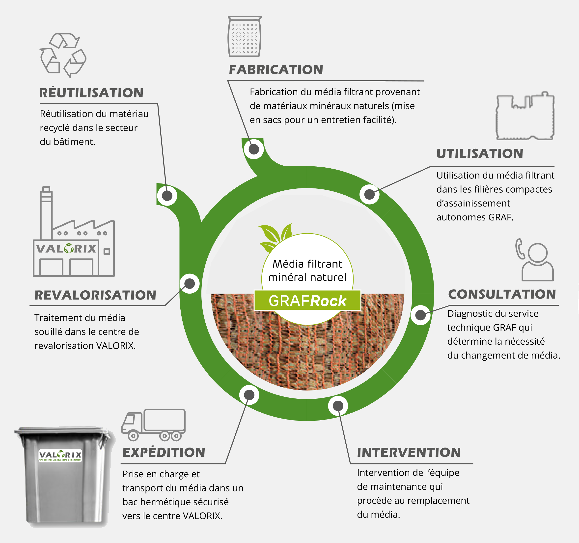 C’est chose faite depuis fin 2023, avec la sortie d’un premier modèle de filtre compact Graf easyCompact, après le rachat de la société Biorock. Cette première version corrige et améliore cet ancien système de traitement des eaux usées à base de laine de roche ( Rockwool ), éprouvé depuis plus de 20 ans.