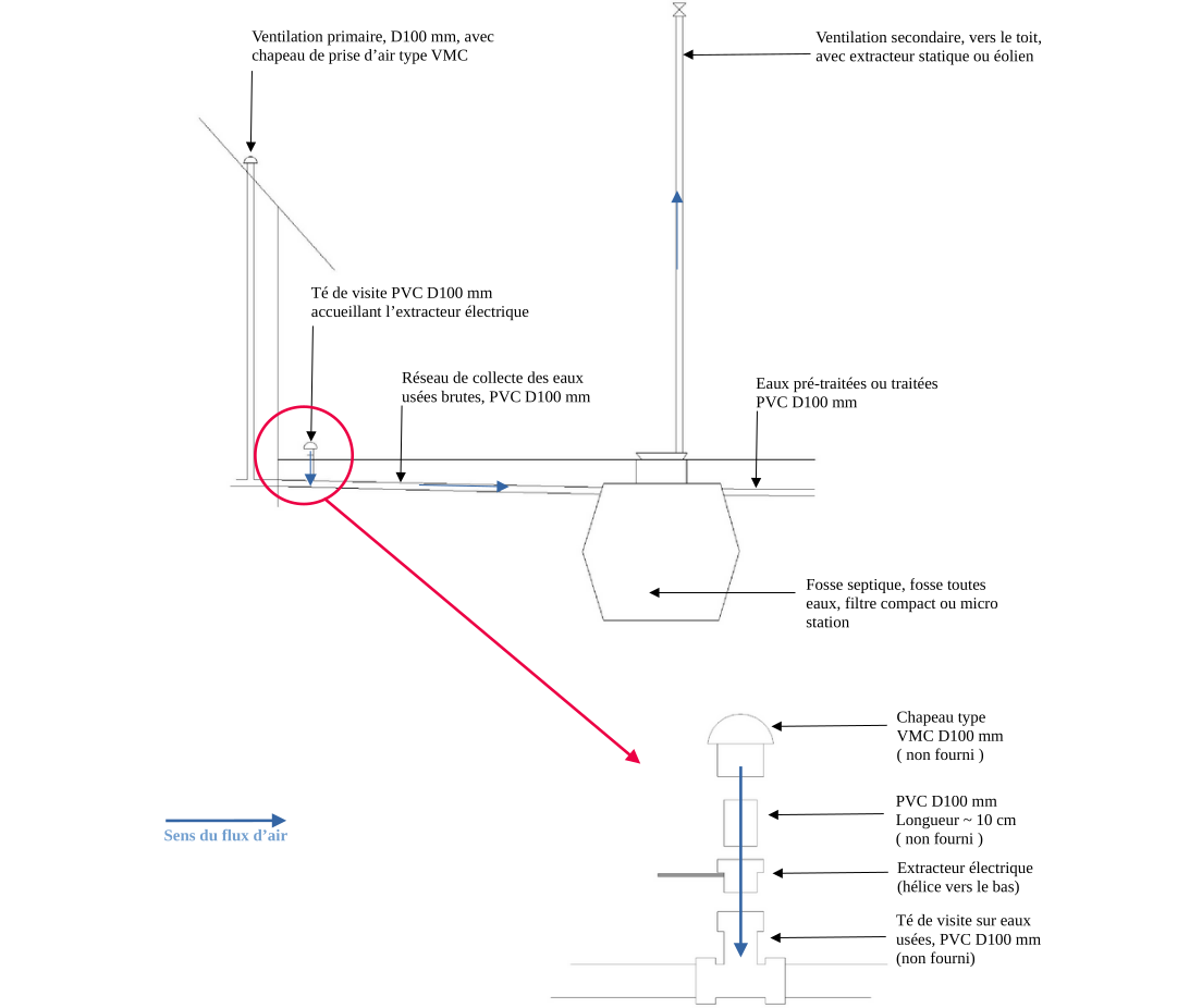 Pour rappel, le circuit de ventilation naturelle d’une fosse toutes eaux est composé d’une entrée d’air ( ventilation primaire ) et d’une sortie d’air ( ventilation secondaire ).