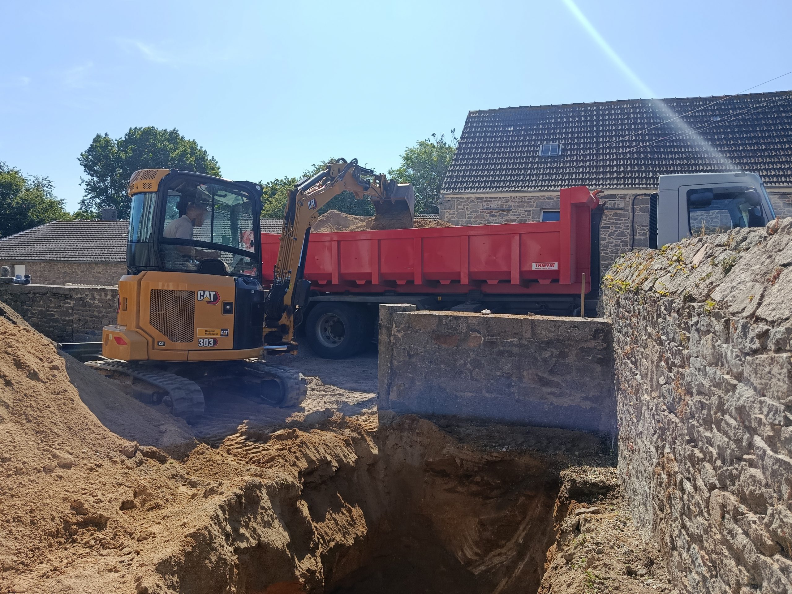 Départ tôt du dépôt de notre partenaire terrassier Fossey Le Blond TP, sous le Soleil, direction Tréauville ( 50340 ), dans le Nord Cotentin, plus précisément la Hague, pour la remise aux normes d’un Assainissement Non Collectif.