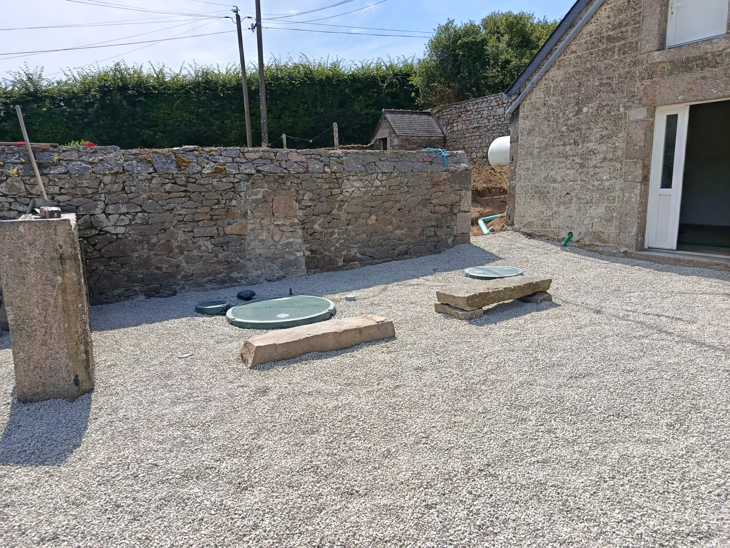 Lors de notre étude de sol et de définition de filière, réalisée en Avril 2025, nous avons retenu, pour cette résidence secondaire , composée de 5 pièces principales, la mise en place d’un filtre compact Graf easyCompact 5 EH, sortie haute, avec poste de relevage intégré. Faute de place suffisante pour une infiltration, les eaux ainsi traitées sont ensuite évacuées vers le réseau hydraulique superficiel.